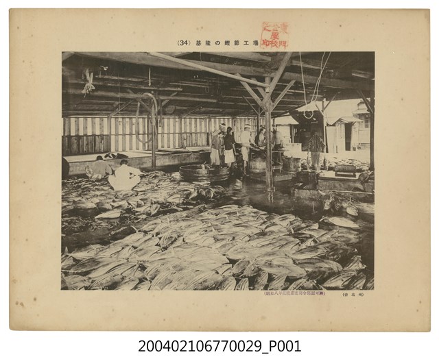 1. 本物件為以基隆的柴魚工場為主題的日治時期黑白照片,照片題名「(34)基隆の鰹節工場」,右下角有一小字樣「(台北州)」標示鰹節工場之所在地,以及「(昭和八年基隆要塞司令部認可濟)」字樣,照片上有東門公學校之印。照片全景為一個搭建的「鰹節工場」,遠景有工人們正在進行鰹魚加工處理。2. 日治時期「惣田鰹」與「真鰹」作為「鰹節」,「鰹節」是日本特有的調味料,而工場內的鰹魚加工完成之後也大部分輸出至日本內地,近景的地上有許多大型鰹魚。