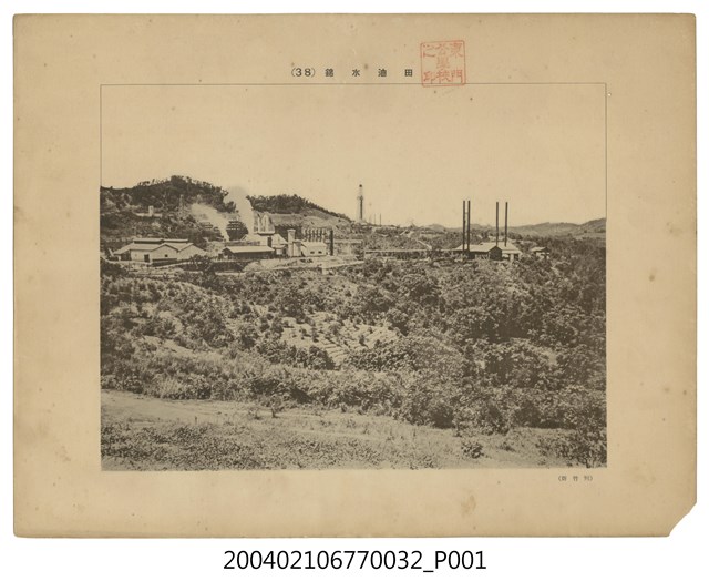 1. 本物件為以錦水油田為主題的日治時期黑白照片,照片題名「(38)錦水油田」,為一景觀,右下角有一小字樣「(新竹州)」標示錦水油田之所在地,照片上有東門公學校之印。照片前景為山坡地,遠景為錦水油田概觀,冒著煙的是油田的採集工場,瓦斯冷卻裝置於後方,為錦水油田的整體概觀。2. 錦水舊名為「赤崎仔」,於清領時期因鄉民羅阿旺其宅邸池塘因瓦斯湧出,池面出現滾泡,而改稱此地為「滾水」,至日治時期則又再一次改名為「錦水」,並於西元1913年開鑿第一口油井。大致位在今日的苗栗縣造橋鄉,當時由日本石油會社經營。