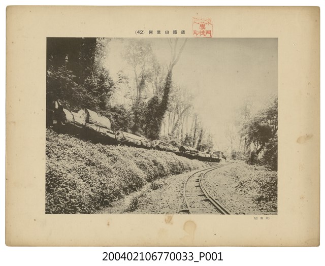 本物件為以阿里山鐵道為主題的日治時期黑白照片,照片題名「(42)阿里山鐵道」,為一建築景觀,右下角有一小字樣「(台南州)」標示當時攝影之所在地,照片上有東門公學校之印。照片全景在神木旁的之字型分道,近景左方有沿著鐵道載運著木頭,阿里山林區內的鐵道,軌道的軌距為2呎6吋。此為鐵道在「スヰツチバ ツク」(按:為之字型爬升,英文:Switch back)的附近運材的景象。