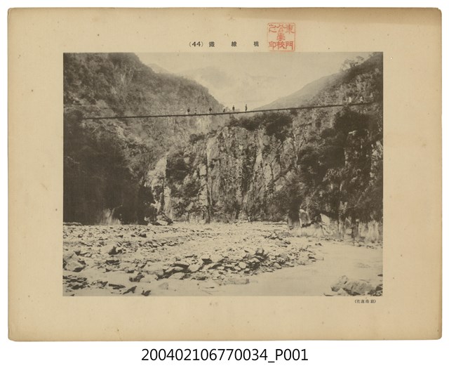 本物件為以鐵線橋為主題的日治時期黑白照片,照片題名「(44)鐵線橋」,為一建築景觀,右下角有一小字樣「(花蓮港廳)」標示當時攝影之所在地,照片上有東門公學校之印。照片全景為由下往上拍攝鐵線橋之景象,鐵線橋位於峽谷之間,連接兩端峽谷的交通,兩端用鋼筋打入崖壁中固定,橋上有行人。此為在太魯閣峽谷中的一座鐵線橋,位於タツキリ溪(按:立霧溪)上。
