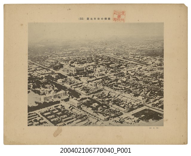 本物件為以臺北市街的俯瞰為主題的日治時期黑白照片,照片題名「(55)臺北市街の俯瞰」,為市街俯瞰照片,右下角有一小字樣「(台北州)」標示出此臺北市街之所在地,照片上有東門公學校之印。照片全景為臺北市街的俯瞰,屋舍比鄰且緊密排列、街區規劃整齊,遠景左方有一幢大型建築物,該建築主體中間的塔樓高、兩旁較低的平行樓層,為總督府廳舍;總督府廳舍左下方,有一幢具有希臘神廟式的建築,中央有圓頂,有立柱支撐,為臺灣總督府博物館。