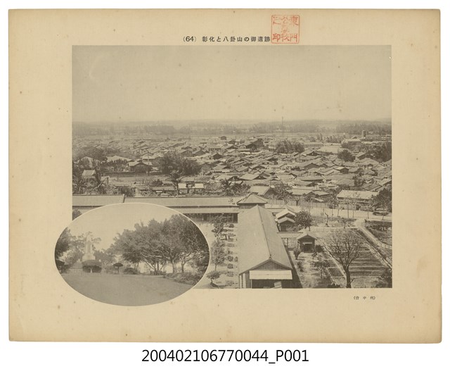 1. 本物件為以彰化與八卦山的御遺跡為主題的日治時期黑白照片,照片題名「(64)彰化と八卦山の御遺跡」,為一處聚落景觀與遺跡地,右下角有一小字樣「(台中州)」標示出此景觀之所在地,照片上有東門公學校之印。照片全景為立於高地上俯瞰之彰化市街,屋舍與屋舍比鄰。小張照片左方矗立於臺基上方的是位於八卦山頂的北白川宮御遺跡碑。2. 北白川宮能久(1847-1895),為日本皇族,伏見宮第十九代邦彥親王之子,諱能久,被封為「親王」。中日馬關議和,北白川宮能久奉命平定臺灣,而後其忽然病死,臺灣民間對其死因有多種傳說。因他是此次攻臺戰死最高階者,成為日本殖民臺灣之象徵,其生前所到之處,稱為「御遺跡地」,並以立碑紀念。