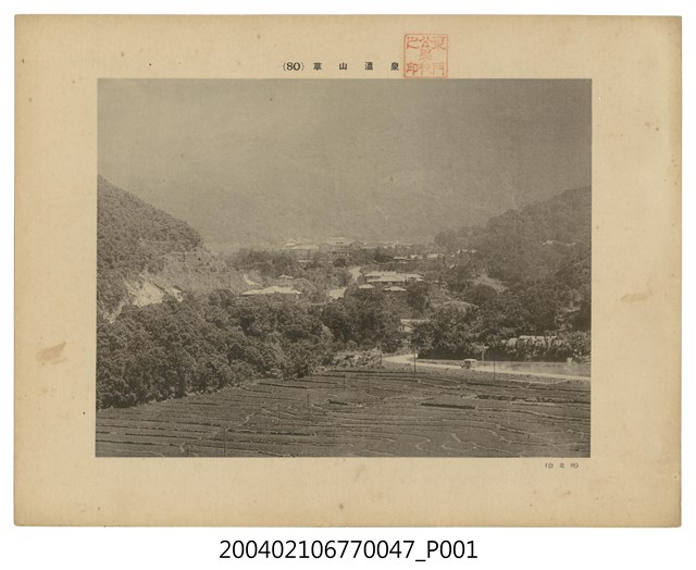 1. 本物件為以草山溫泉為主題的日治時期黑白照片,照片題名「(80)草山溫泉」,為一處自然景觀,右下角有一小字樣「(台北州)」標示出該景觀之所在地,照片上有東門公學校之印。照片中全景草山區域,中央有建築群,因草山有溫泉資源,故此建築群多為浴場、招待所等。遠景中央有一左右為三角形的斜頂屋頂建築物,為草山公共浴場。2. 草山,為陽明山的舊稱。草山公共浴場,建於西元1929年,內分男女浴池,其八角形浴池最具特色。現今(2018年)為臺北教師研習中心。