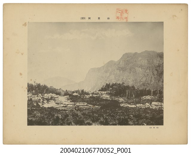 1. 本物件為以阿里山為主題的日治時期黑白照片,照片題名「(89)阿里山」一處景觀,右下角有一小字樣「(台南州)」標示出阿里山之所在地,照片上有東門公學校之印。照片遠景為連綿山脈,近景有小聚落分布在山間高地,聚落旁為蓊鬱森林。2. 現今(2018年)阿里山國家風景區面積達41,520公頃,包含嘉義縣番路鄉、竹崎鄉、梅山鄉、阿里山鄉等4鄉。