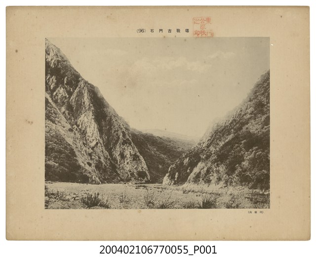 1. 本物件為以石門古戰場為主題的日治時期黑白照片,照片題名「(96)石門古戰塲」一處自然景觀,右下角有一小字樣「(高雄州)」標示出該景觀之所在地,照片上有東門公學校之印。照片中遠景為地點「石門」,指四重溪貫穿兩山夾峙之處,兩山相距僅約30公尺。西邊為海拔約370公尺的虱母山,東邊為海拔約450公尺的五重溪山,兩山緊緊束著四重溪河道,形成石門。夾峙的兩山其實為兩巨大岩石,屬於墾丁層中的礫岩塊。2. 牡丹社事件時,原住民與日軍作戰於此地,稱石門古戰場。