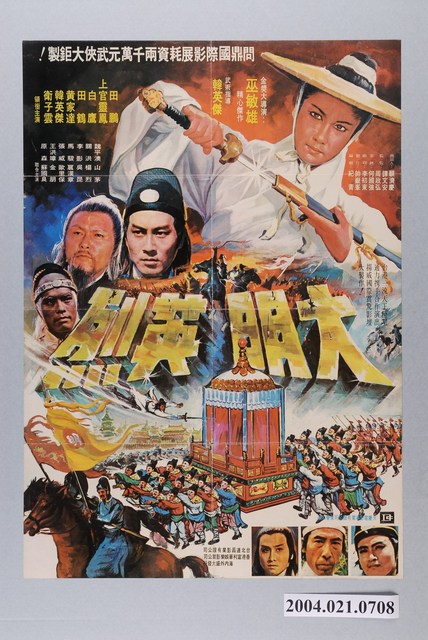 1.香港與臺灣合製片《大明英烈》上映時的中文彩色海報,直式印刷。畫面主要呈現上官靈鳳飾演的白衣劍士,抽刀亮劍的半身畫像,海報下大隊人馬拱著迎親花轎向前行,有名白男子持劍飛向轎子的場景。搭配「問鼎國際影展耗資兩千萬元武俠大鉅製!」、「金獎大導演:巫敏雄 精心傑作」、「武術指導:韓英傑」、「台港一流天王巨星通力攜手合作演出 揚威國際震撼影壇大製作」等文案字樣。海報有四折折痕。2.《大明英烈》(Heroes in the Late Ming Dynasty)是1975年香港與臺灣合製的古裝武俠電影,由大慶電影事業有限公司出品,臺北達昌影業有限公司、香港富利華娛樂影業公司發行,巫敏雄執導,紀青編劇,田鵬、上官靈鳳、白鷹主演的劇情片。