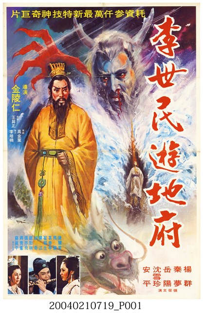 1.手繪海報大師陳子福設計,臺灣電影《李世民遊地府》上映時的中文彩色海報,直式印刷。畫面主要呈現李世民站在龍上,以及涇河龍王怒眼地伸出紅色手的畫面。搭配「耗資参千萬最新特紀神奇巨片」等文案字樣。海報有四折折痕。2.本片是1978年由香港第一影業公司出品,金陵仁編導,沈雪珍、崔福生、岳陽主演的神怪片。