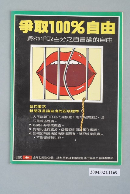 此為一紙質雜誌,此物件以照片為封面,並以白色字體標示物件之名稱,本物件為1985年7月發行之《自由時代》週刊第十五期(自由時代系列總號第76號),封面內容計有〈蔣經國徹查十信,陸潤康自請下台〉等。目錄計有(一)封面故事、(1)陸潤康將為選舉而下台?、(1.1)法律問題政治解決――陸潤康下台暗藏玄機、(2)副總統以下全部換人?――蔡辰洲的絕地大反攻、(3)陸潤康的宦海殘夢、(二)特別報導、(1)美國民主黨與黨外後援會――簡介美國民主黨黨章、(2)美國民主黨黨章、(三)時代新聞、(1)毒酒滿杯、(1.1)陳清吉這個人、(2)中油揩油記、(3)告狀、阿諛、拉生意――立委考察省政醜態畢露、(4)黃石城禮讓?還是國民黨禮讓?、(5)政治漫畫是自由民主的指標、(四)時代評論、(1)李敖:丟掉假團結,才有真革命――回曾心儀的一封信、(2)辦案好像編劇本――華銀搶案豈能胡破亂破、(五)江南遺著選刊、(1)王昇浮沈錄➃、(六)長篇連載、(1)蔣氏朝代➂、(七)台北風聲、(八)小小新聞網、(九)天下傳真 等。 此物件為《自由時代》系列雜誌之一,《自由時代》是黨外政論雜誌之一,於1984年3月12日由鄭南榕所創辦,並且標榜「爭取百分之百的言論自由」,雜誌內容致力於追蹤黨國內幕、打破禁忌話題、評議時政,同時也籌劃街頭社會運動,如:「五一九綠色行動」,其中鄭南榕為保護幫《自由時代》雜誌撰寫文章的作者,於是在目錄標示鄭南榕承擔一切文章的責任,且不在雜誌目錄頁寫上作者姓名。最終在1989年11月11日,鄭南榕自焚身亡7個月後,《自由時代》停刊。所謂「黨外」為中國國民黨之外的政治勢力,「黨外」在國民黨政府的治下運用創辦雜誌的方式表達立場、對抗國民黨政府,這些雜誌、出版品被稱為「黨外雜誌」,《自由時代》亦是其中之一。