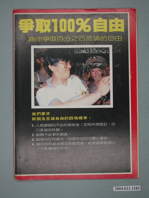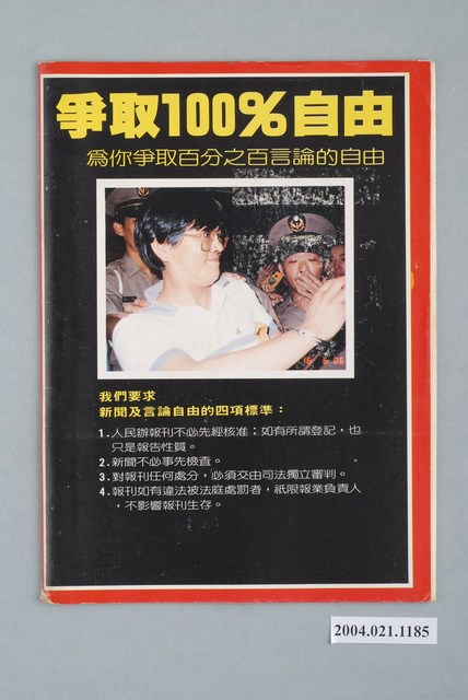 此為一紙質雜誌,此物件以照片為封面,並以白色字體標示物件之名稱,本物件為1986年10月發行之《開拓時代》週刊第12期(自由時代系列總號第140號),主題為「組黨了!――組黨專集」。目錄計有(一)組黨那天-九二八圓山大會實錄、(二)國民黨震撼七十二小時、(1)黨外是這樣組黨的、(三)非辦人不可!?、(四)組黨了、(五)新黨存亡轉捩點――如何召開第一次黨員大會、(六)黨外亮招,老K掀牌――國民黨對付「新黨」的手段、(七)駁斥黨報官報的謬論和誣衊――所謂「政黨的承認」和「共匪支持新黨」、(八)組黨鼓吹家談「民主進步黨」、(九)「海外支部」渴望回來入黨、(十)民主血淚六十年、(十一)九二八――從中山堂到圓山飯店、(十二)組黨大事記、(1)「民主進步黨」競選綱領、(2)「民主進步黨」最新動態、(十三)報˙不報˙老闆˙怎麼報? 等。 此物件為《自由時代》系列雜誌之一,《自由時代》是黨外政論雜誌之一,於1984年3月12日由鄭南榕所創辦,並且標榜「爭取百分之百的言論自由」,雜誌內容致力於追蹤黨國內幕、打破禁忌話題、評議時政,同時也籌劃街頭社會運動,如:「五一九綠色行動」,其中鄭南榕為保護幫《自由時代》雜誌撰寫文章的作者,於是在目錄標示鄭南榕承擔一切文章的責任,且不在雜誌目錄頁寫上作者姓名。最終在1989年11月11日,鄭南榕自焚身亡7個月後,《自由時代》停刊。所謂「黨外」為中國國民黨之外的政治勢力,「黨外」在國民黨政府的治下運用創辦雜誌的方式表達立場、對抗國民黨政府,這些雜誌、出版品被稱為「黨外雜誌」,《自由時代》亦是其中之一。