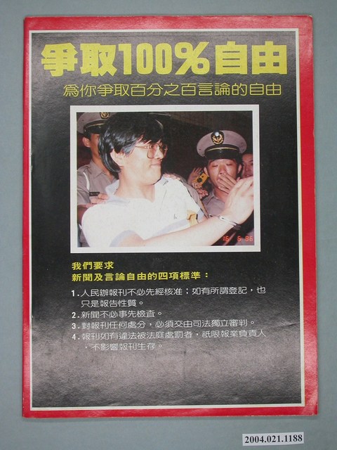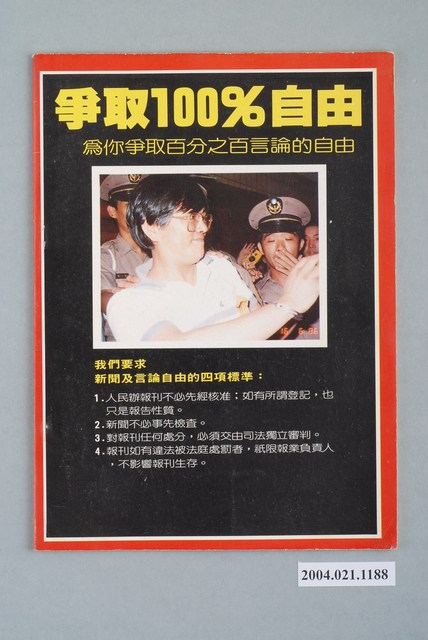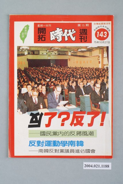 此為一紙質雜誌,此物件以照片為封面,並以白色字體標示物件之名稱,本物件為1986年10月發行之《開拓時代》週刊第15期(自由時代系列總號第143號),封面內容計有〈反了?反了!――國民黨內的反蔣風潮〉、〈反對運動學南韓――南韓反對黨議員進佔國會〉等。目錄計有(一)封面故事、(1)反了?反了!――國民黨內的反蔣風潮、(二)自由觀點、(1)解散警總,才算解嚴、(三)焦點新聞、(1)戒嚴加黨禁,國民黨萬歲、(2)警總永遠和你在一起――解嚴無助於臺灣民主化、(3)民、青兩黨,唉!、(四)臺灣現象、(1)文壇怪狀,作家現形、(2)「這個政權,太難得而不可貴了!」――記關懷中心五周年演講會、(3)釋放所有政治犯、(4)大學校園被污染――參與社邦調查案的臺大學生將被處分、(5)為了選舉炒股票、(6)抓或不抓,真是大問題――「司法大廈滋擾案」的發展、(7)「鄭南榕案」高院開庭記、(8)「陳凱杰命案」最新發展、(9)發霉的神話――從嚴毓萍的新聞談起、(五)替國民黨看風水、(1)不問蒼生問鬼神――蔣介石與風水迷信、(六)選舉專輯、(1)黨外娘子軍,來破關中陣――黨外後援會「女將策略」分析、(七)國民黨官場現形記之①、(1)翻雲覆雨一高手――黃少谷(上)、(八)特別報導、(1)漢江又起風暴――全斗煥逮捕俞成煥、(2)他山之石,可以攻錯――反對運動學南韓、(九)長篇連載、(1)龍雲傳②、(1.1)反顧征桂、(十)萬能記者阿吉仔、(1)殭屍萬歲,長相左右、(2)女兵被抱,停止呼吸 等。 此物件為《自由時代》系列雜誌之一,《自由時代》是黨外政論雜誌之一,於1984年3月12日由鄭南榕所創辦,並且標榜「爭取百分之百的言論自由」,雜誌內容致力於追蹤黨國內幕、打破禁忌話題、評議時政,同時也籌劃街頭社會運動,如:「五一九綠色行動」,其中鄭南榕為保護幫《自由時代》雜誌撰寫文章的作者,於是在目錄標示鄭南榕承擔一切文章的責任,且不在雜誌目錄頁寫上作者姓名。最終在1989年11月11日,鄭南榕自焚身亡7個月後,《自由時代》停刊。所謂「黨外」為中國國民黨之外的政治勢力,「黨外」在國民黨政府的治下運用創辦雜誌的方式表達立場、對抗國民黨政府,這些雜誌、出版品被稱為「黨外雜誌」,《自由時代》亦是其中之一。