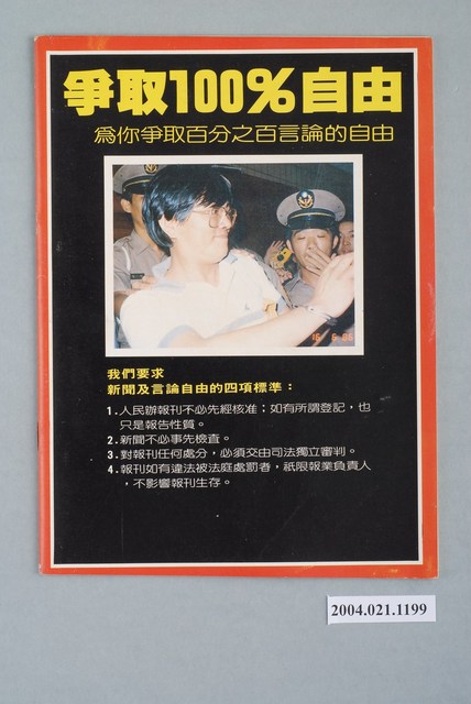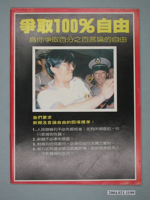 此為一紙質雜誌,此物件以照片為封面,並以白色字體標示物件之名稱,本物件為1987年1月發行之《開拓時代》週刊第26期(自由時代系列總號第154號),封面內容計有〈兪國華下台眾望所歸,李登輝兼任行政院長?〉、〈如何做罷――民進黨全面罷選監委的考驗〉、〈你滿意蔣經國嗎?――臺灣的民意調查可信知多少〉等。目錄計有(一)封面故事、(1)俞國華下台眾望所歸,李登輝兼任行政院長?、(2)「皇恩浩蕩」台籍政客、(二)自由觀點、(1)衝破報禁,追求公利、(三)焦點新聞、(1)如何作罷――民進黨全面罷選監委的考驗、(2)要罷不罷、(3)民進黨示威抗議檢委選舉、(4)林文郎有話要說、(四)專題報導、(1)你滿意蔣經國嗎?――臺灣的民意調查可信知多少、(2)趙少康的「一人基金會」、(3)美國民意調查面面觀、(五)臺灣現象、(1)民進黨未進場,國民黨先震動――從委員內鬪看立法院未來形勢、(2)天下還有白做的黑牢――剖析國安法草案的「不得上訴」、(3)國民黨與民進黨的第三類接觸、(4)人權的勝利――國際特赦組織紀念會演講、(5)綠島變奏曲――白雅燦、陳明忠近況待關懷、(6)民主野火,蔓延政大、(7)簡介罷免的技巧、(8)苗縣展開罷免縣長簽名活動、(9)「謝趙大決戰」繼續延期、(10)丁大衛的新職、(11)日本人吃肉,臺灣人啃骨――日本勢力下的臺灣企業、(12)擊不碎的玻璃人――記新玻「勞資關係座談會」、(13)擋到底!――永安村民展開第三度抗議行動、(14)火坑前,伸援手――彩虹之家舉行抗議販賣人口示威活動、(六)自由談、(1)假民主,真法治――評黃少谷的法治觀念、(七)新黨之頁、(1)康寧祥的路、(八)天下傳真、(1)國民黨是臺灣最大的風險――「開發中國家風險排行榜」的啓示、(九)替國民黨看風水、(1)風水高手追截龍脈,天縱英明慈湖結穴、(十)萬能記者阿吉仔、(1)警總撤銷,國家才能安全、(2)中共暴政,至少沒有戒嚴 等。 此物件為《自由時代》系列雜誌之一,《自由時代》是黨外政論雜誌之一,於1984年3月12日由鄭南榕所創辦,並且標榜「爭取百分之百的言論自由」,雜誌內容致力於追蹤黨國內幕、打破禁忌話題、評議時政,同時也籌劃街頭社會運動,如:「五一九綠色行動」,其中鄭南榕為保護幫《自由時代》雜誌撰寫文章的作者,於是在目錄標示鄭南榕承擔一切文章的責任,且不在雜誌目錄頁寫上作者姓名。最終在1989年11月11日,鄭南榕自焚身亡7個月後,《自由時代》停刊。所謂「黨外」為中國國民黨之外的政治勢力,「黨外」在國民黨政府的治下運用創辦雜誌的方式表達立場、對抗國民黨政府,這些雜誌、出版品被稱為「黨外雜誌」,《自由時代》亦是其中之一。