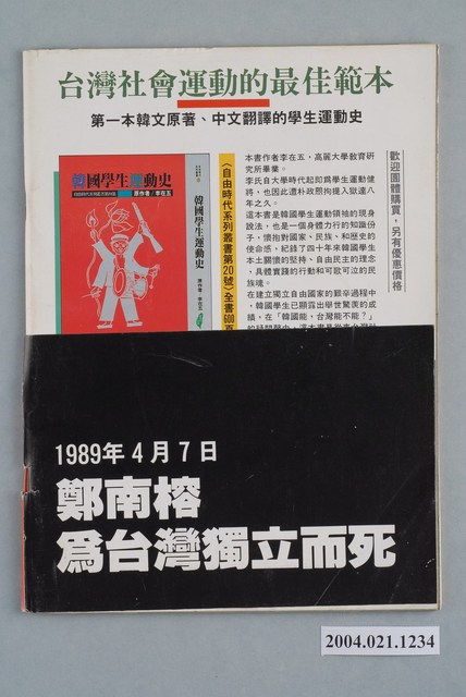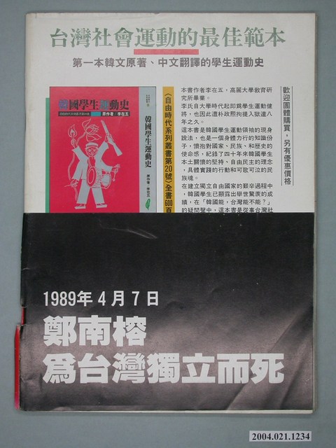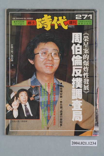 此為一紙質雜誌,此物件以照片(封面人物:周伯倫∕封面人物:翁祖悼)為封面,並以白色字體標示物件之名稱,本物件為1989年4月發行之《鄉土時代》週刊(總號第271期),封面內容計有〈榮星案的爆炸性發展――周伯倫反撲調查局〉、〈李登輝安排,李元簇「過渡行政院長」〉、〈調查局「科學辦案」,五月花酒家「花酒逼供」〉、〈揭發榮星案中未曝光的四名議員〉、〈四月六日榮星案開庭,全程實況報導〉、〈調查局長翁文維之子,台北市調查處第四科科長翁祖悼說:四年前,周伯倫是調查局線民〉等。目錄計有(一)時代觀點、(1)漠視弱勢者的受難,就是迫害人權的同謀――從洪基旺、陳維都遭司法迫害却不見聲援說起、(二)封面故事、(1)榮星案內幕再爆炸,周伯倫反撲調查局――榮星案開庭,全程實況報導、(2)周伯倫狠咬調查局,翁文維「保留追訴權」,「這是亂行起訴」,「這是欲加之罪」,「這是什麼證據」…――涉案官員與議員如是答辯、(3)全看周伯倫和李登輝了!――榮星案中未曝光的四位議員、(4)民進黨對「司法迫害」的對策、(5)民進黨如何處理涉案黨員?、(三)舞弊案專欄、(1)四號廣場失土記、(2)王昭明收中安公司的紅包?、(3)放水十八年如一日――台北市政府在「中安局」中的角色、(4)口號「打」特權,發跡「靠」特權――剖析東帝士集團、(5)海關纏鬥調查局――「集體請假」抗議調查局肅貪的內幕、(6)高雄市議會也有「榮星案」?、(7)高雄市政大樓復建補強工程偷渡得逞、(四)特務特寫、(1)一封監委看不到的軍人陳情書――警總郵檢監察院,戒嚴陰魂依然不散、(2)最囂張的特務頭子――剖宋心濂和國民黨兩大高階層情治會報、(五)政治氣象台、(1)李元簇將出任「過渡」行政院長、(2)「國家戰略研究院」――李登輝插手軍方的第一步、(3)郭婉容將率團赴北京參加亞銀年會、(4)沒有那款腳倉,要吃那款瀉藥?――國民黨「大中國架構」立法下的「意淫」與矛盾、(5)國民黨修正選罷法,取消禁止「叛亂犯」助選規定、(6)背水一戰的民進黨、(六)臺灣現象、(1)「嘉義」張博雅!――嘉義市將興建全臺灣第一座二二八和平紀念碑、(2)張博雅:我自己做的事,我會自己負責、(3)李登輝大興「立威工程」,陳維都變成一顆螺絲釘、(4)凌蕙蕙、吳逸寧的「中國小姐」遺憾、(5)羅張「大義滅親」,溫錦隆一命嗚呼、(6)前有古人,後有來者――李登輝實施肅貪專案,手法襲自蔣經國、(7)蔣經國的天空才有彩虹?、(8)「台北最後一塊綠地」關渡平原開發計劃、(9)黃小英「忍辱」飛返臺灣、(10)總統選舉先撤銀,末代老賊來鍍金――立委砲轟七十九年度國民大會預算、(七)海外通訊、(1)彭明敏辭職後的FAPA力求整合和調整、(2)聲望與年齡成反比的彭明敏、(3)「臺獨聯盟」未介入FAPA選舉――提高利率之後,央行將如何再度緊縮銀根 等。 此物件為《自由時代》系列雜誌之一,《自由時代》是黨外政論雜誌之一,於1984年3月12日由鄭南榕所創辦,並且標榜「爭取百分之百的言論自由」,雜誌內容致力於追蹤黨國內幕、打破禁忌話題、評議時政,同時也籌劃街頭社會運動,如:「五一九綠色行動」,其中鄭南榕為保護幫《自由時代》雜誌撰寫文章的作者,於是在目錄標示鄭南榕承擔一切文章的責任,且不在雜誌目錄頁寫上作者姓名。最終在1989年11月11日,鄭南榕自焚身亡7個月後,《自由時代》停刊。所謂「黨外」為中國國民黨之外的政治勢力,「黨外」在國民黨政府的治下運用創辦雜誌的方式表達立場、對抗國民黨政府,這些雜誌、出版品被稱為「黨外雜誌」,《自由時代》亦是其中之一。