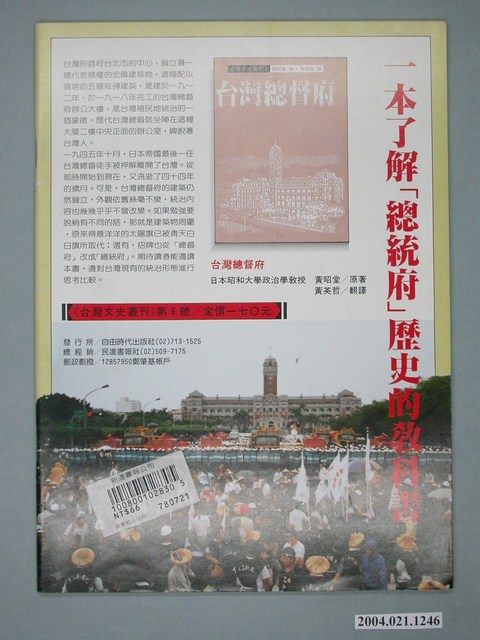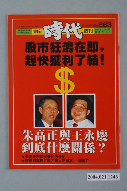 此為一紙質雜誌,此物件以照片為封面,並以白色字體標示物件之名稱,本物件為1989年7月發行之《創新時代》週刊(自由時代總號第283期),封面內容計有〈股市狂瀉在即,趕快獲利了結!〉、〈朱高正與王永慶到底什麼關係?〉、〈朱高正四處碰壁的西遊記〉、〈陳婉真專欄:「黑名單人物特寫」――郭清江〉等。目錄計有(一)時代觀點、(1)美國燒國旗無罪,臺灣降旗坐牢!、(二)封面故事、(1)朱高正與王永慶到底什麼關係?、(1.1)台塑十三樓招待所、(2)朱高正的西遊記――揭開朱高正在美國的真正行程、(3)王永慶開銀行,開在美國、(3.1)理查.愛倫其人其事、(4)無疾而終的「貢獻」――朱高正在「中洋子事件」的評價問題、(5)股市狂瀉在即,趕快獲利了結――選舉內閣打壓股市行動出籠、(三)民進黨之頁、(1)有瑕疵就是「骯髒」?――雲林縣黨部改選有瑕疵,農權會及蘇洪月嬌連線獲勝、(2)政客也要說話算話、(2.1)誰勸朱高正留在立法院?、(2.2)黨中央看雲林選舉問題、(3)民進黨向分裂「前進」?――人少作用大,前進系在民進黨派系紛爭中的角色、(四)臺灣現象、(1)沒有證據,就是證據?――國民黨強行起訴陳婉真、(1.1)「叛亂」還是「亂判」?――「叛亂罪」的執法標準何在!、(1.2)軍人寫錯字,博士看不出、(2)民意調查稅,核四廠受歡迎?、(五)特務特寫、(1)官方急著否認,軍方趁機吹噓――中共捕獲十三名「國特」的真相、(1.1)國民黨二十年來「敵後工作」側記、(2)不搞群眾運動的國特――國民黨對大陸的情報活動、(3)中國製造台特,臺灣生產匪諜――降罪只為剷除異己,國共兩黨師出同門、(六)政治氣象台、(1)希望能在立法院質詢爸爸?――李慶華決意參選立委,李煥先支持後反對、(2)玩法弄權,化明為暗――官商立委勾結一體,海關進口稅則修正草案輕騎過關、(3)兩份草案一個目的――老國代興風作浪不斷進行政治勒索、(七)臺獨風雲、(1)告別沈默的臺獨旗手――六月二十四日詹益樺公祭與追思晚會、(2)我不能做一流丈夫的二流太太――葉菊蘭向美國洛杉磯臺灣同鄉會演講紀錄、(3)臺灣的觀鳥已經叫了――為建立一個新而獨立的臺灣國奮力不懈、(4)臺灣獨立運動不容醜化、矮化、(5)和臺灣一同尋找命運的答案、(八)財經熱線、(1)往金融自由化之路,利弊各見――對財政部開放外國證券商來臺營業的檢討、(九)專題報導、(1)無悔的不歸路,斷腸的黑名單-郭清江不得返臺奔父喪、(1.1)專訪郭清江 等。 此物件為《自由時代》系列雜誌之一,《自由時代》是黨外政論雜誌之一,於1984年3月12日由鄭南榕所創辦,並且標榜「爭取百分之百的言論自由」,雜誌內容致力於追蹤黨國內幕、打破禁忌話題、評議時政,同時也籌劃街頭社會運動,如:「五一九綠色行動」,其中鄭南榕為保護幫《自由時代》雜誌撰寫文章的作者,於是在目錄標示鄭南榕承擔一切文章的責任,且不在雜誌目錄頁寫上作者姓名。最終在1989年11月11日,鄭南榕自焚身亡7個月後,《自由時代》停刊。所謂「黨外」為中國國民黨之外的政治勢力,「黨外」在國民黨政府的治下運用創辦雜誌的方式表達立場、對抗國民黨政府,這些雜誌、出版品被稱為「黨外雜誌」,《自由時代》亦是其中之一。