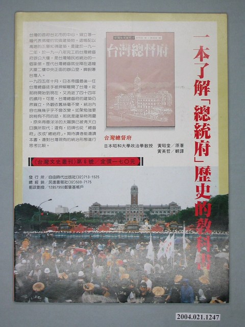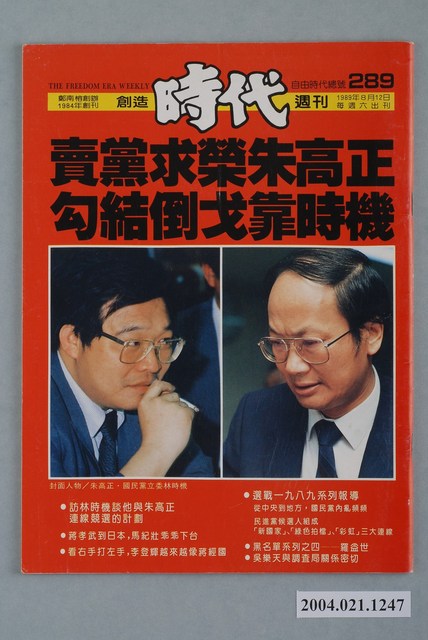此為一紙質雜誌,此物件以照片(封面人物∕朱高正•國民黨立委林時機)為封面,並以白色字體標示物件之名稱,本物件為1989年8月發行之《創新時代》週刊(自由時代總號第289期),封面內容計有〈賣黨求榮朱高正,勾結倒戈靠時機〉、〈訪林時機談他與朱高正連線競選的計畫〉、〈蔣孝武到日本,馬紀壯乖乖下台〉、〈看左手打右手,李登輝越來越像蔣經國〉、〈選戰一九八九系列報導〉、〈從中央到地方,國民黨內亂頻頻〉、〈民進黨候選人組成「新國家」、「綠色拍檔」、「彩虹」三大連線〉、〈黑名單系列之四――羅益世〉、〈吳樂天與調查局關係密切〉等。 此物件為《自由時代》系列雜誌之一,《自由時代》是黨外政論雜誌之一,於1984年3月12日由鄭南榕所創辦,並且標榜「爭取百分之百的言論自由」,雜誌內容致力於追蹤黨國內幕、打破禁忌話題、評議時政,同時也籌劃街頭社會運動,如:「五一九綠色行動」,其中鄭南榕為保護幫《自由時代》雜誌撰寫文章的作者,於是在目錄標示鄭南榕承擔一切文章的責任,且不在雜誌目錄頁寫上作者姓名。最終在1989年11月11日,鄭南榕自焚身亡7個月後,《自由時代》停刊。所謂「黨外」為中國國民黨之外的政治勢力,「黨外」在國民黨政府的治下運用創辦雜誌的方式表達立場、對抗國民黨政府,這些雜誌、出版品被稱為「黨外雜誌」,《自由時代》亦是其中之一。