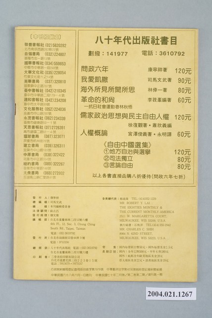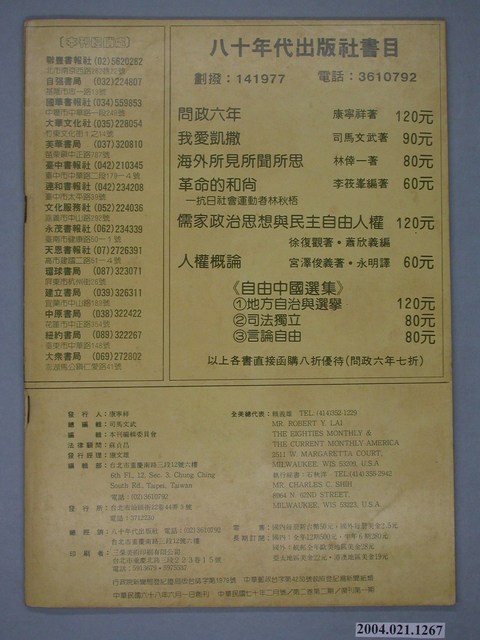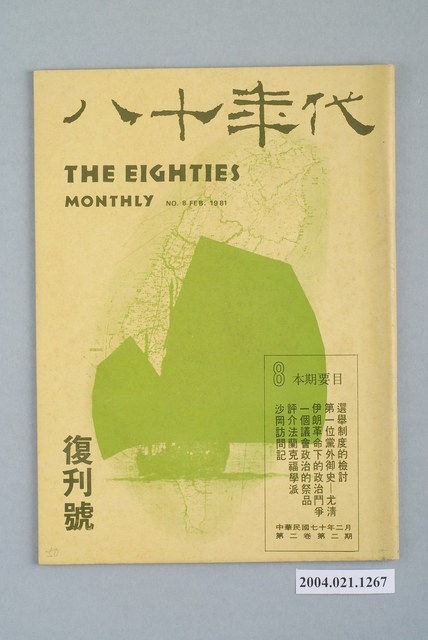 此為紙質雜誌,以交疊的臺灣地圖與帆船剪影為封面,為1981年2月發行之《八十年代》復刊號。本期封面內容計有〈選舉制度的檢討〉、〈第一位黨外御史――尤清〉、〈伊朗革命下的政治鬥爭〉、〈一個議會政治的祭品〉、〈評介法蘭克福學派〉、〈沙岡訪問記〉。目錄計有(一)社論、(二)編輯室筆記、(三)政治論述、(1)選舉的觀察與沉思(劉志傑)、(2)建立正常的選舉制度(黃越欽)、(3)民主是可以走得通的一條路-看臺灣這次的補選(徐復觀)、(4)監察院的現在與未來(周士豪)、(5)閉關自守三十年的國家掄才大典-高普考及特考的種種弊端(劉琦文)、(四)人物專訪、(1)養豬人的畫像-年輕人心目中的黃順興先生(許榮和)、(2)吳豐山的政論與政治(邵維賢)、(3)第一位黨外御史-尤清博士(資料室)、(3.1)為法治獻身的尤清、(3.2)維護人的尊嚴、(五)世局鳥瞰、(1)伊朗革命下的政治鬥爭(顧京譯)、(2)第三世界對雷根的反應(陳浩譯)、(3)是誰在統治美國?(司馬文武)、(4)一個反對派領袖的困境-訪問菲律賓的阿奎諾(吳達然譯)、(5)強而有力的第一夫人-既是明星,也是奴隸(吳達然譯)、(六)台北話題、(七)中共問題、(1)重寫中共歷史(鄧世新譯)、(2)使革命起死回生?(劉文漢譯)、(八)新聞之窗、(1)美國名記者克朗凱其人其事(高凱)、(2)經濟記者的真與假(謝天)、(3)暖流停刊事件(劉東玄)、(4)出版品的取締問題(魏誠)、(九)文學思想、(1)法蘭克福學派-馬克思主義的一個變形(蔡耀明)、(2)在雲飛的地方(趙聞政)、(3)沙岡訪問記(林怡安譯)、(十)國會春秋、(1)一個議會政治的祭品-立法院議事規則修正風波、(1.1)談立法院議事規則修正的爭議(單傑民)、(1.2)服從多數,也應尊重少數-再談立法院議事規則修正的爭議(單傑民)、(1.3)康寧祥委員對議事規則修正案的意見、(1.4)青年黨對議事規則修正案的書面意見、(十一)本期漫畫、(1)Co Co揮筆(Co Co)、(2)妙妙貓等(康文雄輯譯)、(十二)國際傳真、(1)世界間諜大戰、(1.1)一、世界間諜大戰名人錄(康文雄譯)、(十三)舊文新刊、(1)中國為什麼沒有輿論(胡霖)、(2)我看胡適之先生(蔣廷敝)、(3)論思想統一(梁實秋) 等。 此件為康寧祥發行、江春男總編的《八十年代》雜誌,為臺灣黨外雜誌的重要代表,有「黨外雜誌編輯群的搖籃」之稱,由學者以及新聞界從事批判性的政論,與黃信介發行的《美麗島》雜誌成為「黨外政治」運動兩條路線各自的代表。所謂「黨外」為中國國民黨之外的政治勢力,「黨外」在國民黨政府的治下運用創辦雜誌的方式表達立場、對抗國民黨政府,這些雜誌、出版品被稱為「黨外雜誌」,《八十年代》亦是其中之一。最終,這股媒體趨勢在1986年民進黨成立、1987年解除戒嚴之後逐漸式微。