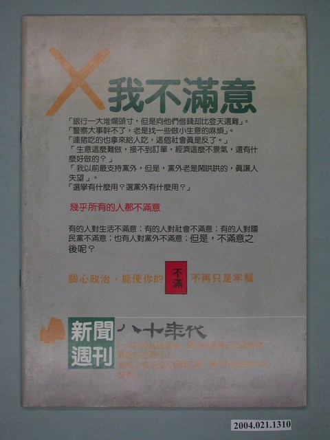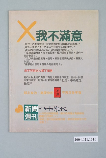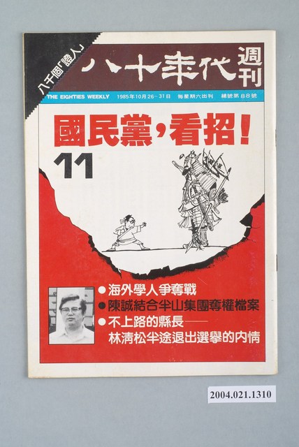 此為紙質雜誌,為1985年10月發行之《八十年代》週刊第11期(總號第88號)。本期封面內容計有〈國民黨,看招!〉、〈海外學人爭奪戰〉、〈陳誠結合半山集團奪權檔案〉、〈不上路的縣長――林清松半途退出選舉的內情〉、〈八千個「證人」〉等。目錄計有(一)封面裏:八千個證人、(二)社評:巨變、拒變、懼變、(三)封面故事:國民黨,看招!、(1)國民黨式的選舉-從強硬變為溫和的權威主義政權(Edwin A. Winkler著/徐文展譯)、(2)黨外退選的三種模式(連振安)、(3)我參加了省黨部的文宣特案小組(讀者)、(4)台北縣:便衣先生,請滾蛋!(陳俠隱)、(5)宜蘭縣:黃煌雄回來以後(廖政農)、(6)苗栗縣:苗栗的最新拍檔(江一波)、(7)屏東縣:邱連輝的新聞集錦(陳屏風)、(8)彰化縣:翁金珠前後有追兵(洪宜君)、(9)嘉義市:諸羅山下的張博雅(洪新榮)、(10)高雄縣:余陳月瑛的雨傘(吳立人)、(11)蔡明耀的支票(張國豐)、(12)全省黨外候選人通訊處(本刊編輯部)、(四)獨家新聞、(1)林清松退出選舉的內情(胡博)、(2)林清松這個人(陳啓成)、(五)特別報導:紀念光復四十年、(1)從「半山」到「阿海」-陳誠結合半山集團的奪權檔案(劉坡遠)、(六)美國通訊、(1)海外學人爭奪戰(魏明山)、(七)頭條新聞、(1)十信案的八千個證人(王真)、(2)蘇南成在中常會上告狀(莊風和)、(3)高雄市新聞要搞獨裁?、(八)黨外佈告欄、(1)搜扣「南臺灣」的新手法、(2)黨外的助選清單、(3)黨外的第五波、(4)尤清與鄭余鎮的「結」、(5)自決與殖民地、(6)李定中刮「黨外」的耳光、(7)毫無悔意的李亞頻、(8)選委會與「本黨」、(九)選舉資料室、(1)國民黨必需回答的一百個問題、(十)壓卷人物、(1)不上路的縣長-林清松 等。 此件為康寧祥發行、江春男總編的《八十年代》雜誌,為臺灣黨外雜誌的重要代表,有「黨外雜誌編輯群的搖籃」之稱,由學者以及新聞界從事批判性的政論,與黃信介發行的《美麗島》雜誌成為「黨外政治」運動兩條路線各自的代表。所謂「黨外」為中國國民黨之外的政治勢力,「黨外」在國民黨政府的治下運用創辦雜誌的方式表達立場、對抗國民黨政府,這些雜誌、出版品被稱為「黨外雜誌」,《八十年代》亦是其中之一。最終,這股媒體趨勢在1986年民進黨成立、1987年解除戒嚴之後逐漸式微。