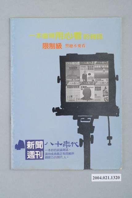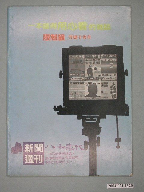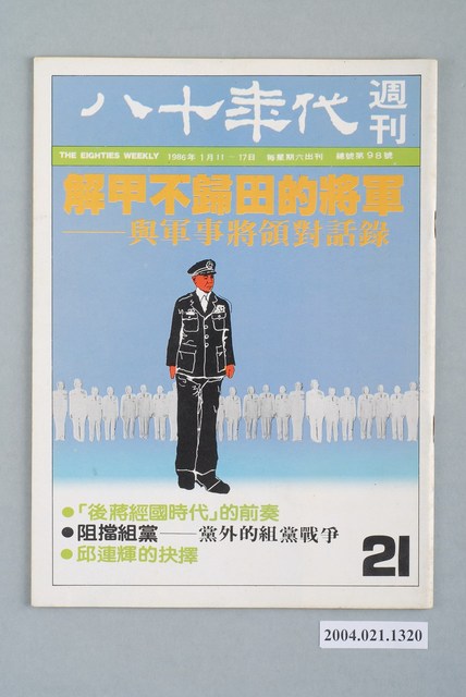 此為紙質雜誌,為1986年1月發行之《八十年代》週刊第21期(總號第98號)。本期封面內容計有〈解甲不歸田的將軍――與軍事將領對話錄〉、〈「後蔣經國時代」的前奏〉、〈阻擋組黨――黨外的組黨戰爭〉、〈邱連輝的抉擇〉等。目錄計有(一)封面裏:金水伯的繼承危機、(二)社評:謀殺憲法?、(三)封面故事、(1)解甲不歸田的將軍-與軍事將領的對話錄(司馬文武)、(2)錢復「情節」(徐文展)、(四)政治觀察、(1)「後蔣經國時代」的前奏(南民)、(2)邱連輝的盤旋與各界的反應(本刊採訪組)、(五)頭條新聞、(1)阻擋組黨-組黨戰爭紀實(陳啓成)、(六)美國通訊、(1)右刮無名氏,左掃「中國之春」-林希翎在紐約的記者招待會(李家礎)、(七)特別報導:八十年代舉辦學術座談會紀錄、(1)學術下艋舺-記邱垂亮與張忠棟的演講會(廖政農)、(2)反共主義與法統主義的終點站(本刊採訪組)、(3)為了生存,我贊成狗急跳牆(本刊採訪組)、(八)第二波、(1)「南園」殘夢、(九)台北快報、(1)1985年南華早報的查禁清單(李競生)、(2)「超級戰將」的詭辯-評關中的言論(胡進安)、(十)特稿、(1)核三廠神秘之火與台電的詭譎文化(馬非白)、(2)資訊大展下的沈思(朱新)、(3)被歐洲放棄的臺灣(張懷德)、(十一)財經、(1)虎年之年-加值型營業稅(陶朱太史)、(十二)國際政治、(1)南韓的黨外(馬文)、(十三)黨外佈告欄、(1)黨外的承諾-市議員磋商聯合服務、(2)張俊雄質詢-請發揚臺灣文化、(3)祈福林弘宣-長老教會感恩禮拜、(4)李敖出手-林正杰、吳祥輝吃上官司、(5)桃園黨外清道夫-還我乾淨的鄉土、(6)陳文輝獄中競選、(7)尤清服務處-好戲登場、(8)諸羅山大戰-張榮藏等人再度參選、(9)中壢黨外餐會-李鴻禧亮相、(10)林弘宣感謝函、(十四)壓卷人物、(1)「我的朋友」胡適之 等。 此件為康寧祥發行、江春男總編的《八十年代》雜誌,為臺灣黨外雜誌的重要代表,有「黨外雜誌編輯群的搖籃」之稱,由學者以及新聞界從事批判性的政論,與黃信介發行的《美麗島》雜誌成為「黨外政治」運動兩條路線各自的代表。所謂「黨外」為中國國民黨之外的政治勢力,「黨外」在國民黨政府的治下運用創辦雜誌的方式表達立場、對抗國民黨政府,這些雜誌、出版品被稱為「黨外雜誌」,《八十年代》亦是其中之一。最終,這股媒體趨勢在1986年民進黨成立、1987年解除戒嚴之後逐漸式微。