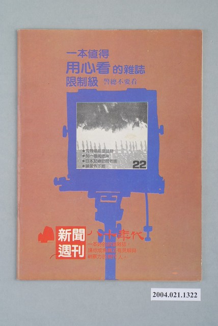 此為紙質雜誌,為1986年1月發行之《八十年代》週刊第23期(總號第100號)。本期封面內容計有〈一位退休中將的告白〉、〈菲律賓大選特別報導――誰能用選票推翻獨裁者?〉、〈沈昌煥的貢獻?〉、〈地方選舉特別報導〉、〈青青河畔「吵」――河川地爭奪戰〉、〈尷尬的章孝嚴〉、〈警察總按幾次鈴!――談臺灣的戶籍政策〉等。目錄計有(一)封面裡:「等爆發石油危機,再談?」李模如是說、(二)社評:傀儡司法、(三)黨外看不到、(1)一位退休中將告白(胡光啓)、(四)特別報導:菲律賓大選特別報導、(1)誰能用選票趕走獨裁者?-菲律賓式的大選(司馬文武)、(五)台北話題、(1)FAPA將在臺灣設立分會(陳啓成)、(2)沈昌煥的貢獻?-沈昌煥兩次查禁自立晚報的內幕(馮世庵)、(六)美國通訊、(1)第四十八屆國際筆會的「黨外精神」(本刊駐美特派員李家礎)、(七)國會側記、(1)國民黨中常會的嘉獎(李志中)、(2)圓山飯店不必也不能賺錢(陳一安)、(八)頭條新聞、(1)警察總按幾次鈴!-談臺灣的戶籍政策(莊風和)、(2)戒嚴祇3%,「火腿」准兩條-警總管制下的無線電台(盧天定)、(3)青島河畔「吵」,爭奪為鈔票-北市河川地風波(洪新榮)、(4)魚肉還鄉-國會的遊說團(陳屏風)、(5)先「整」投資大眾,再「整」養豬工人-蔡克寬如何「重整」和信興(劉坡遠)、(九)政治觀察、(1)比戒嚴法還要戒嚴的「總動員法」(杜雅言)、(十)北京參考消息、(1)中共的「太子黨」惹禍-趙紫陽、胡耀邦的兒子曝光(顏啓佑)、(十一)環境、(1)依賴與污染-臺灣化學工業的一個考察(庶民)、(十二)選舉報導、(1)嘉義黨外三人行(潘思源)、(2)國民黨也傷腦筋-萬丹集體退黨風波(劉去安)、(3)國民黨在宜蘭投靠黨外(廖政農)、(十三)特稿、(1)儒家倫理與戒嚴體制(殷惠敏)、(2)新玻的自救自營與工業民主(本刊採訪組)、(十四)黨外佈告欄、(1)北縣三人連線組成「特攻隊」、(2)張溫鷹出國被阻,年底可能參選國代、(3)洪壽美暫別政壇,樂觀從事影藝、(4)黨外女聯會慨談婦女參政、(5)陳文輝等三人又遇司法難關、(6)台權會再辦座談、(6.1)治安與人權、(7)紀念張勱百歲冥誕學術研討會、(十五)壓卷人物、(1)尷尬的章孝嚴 等。 此件為康寧祥發行、江春男總編的《八十年代》雜誌,為臺灣黨外雜誌的重要代表,有「黨外雜誌編輯群的搖籃」之稱,由學者以及新聞界從事批判性的政論,與黃信介發行的《美麗島》雜誌成為「黨外政治」運動兩條路線各自的代表。所謂「黨外」為中國國民黨之外的政治勢力,「黨外」在國民黨政府的治下運用創辦雜誌的方式表達立場、對抗國民黨政府,這些雜誌、出版品被稱為「黨外雜誌」,《八十年代》亦是其中之一。最終,這股媒體趨勢在1986年民進黨成立、1987年解除戒嚴之後逐漸式微。