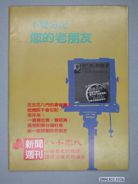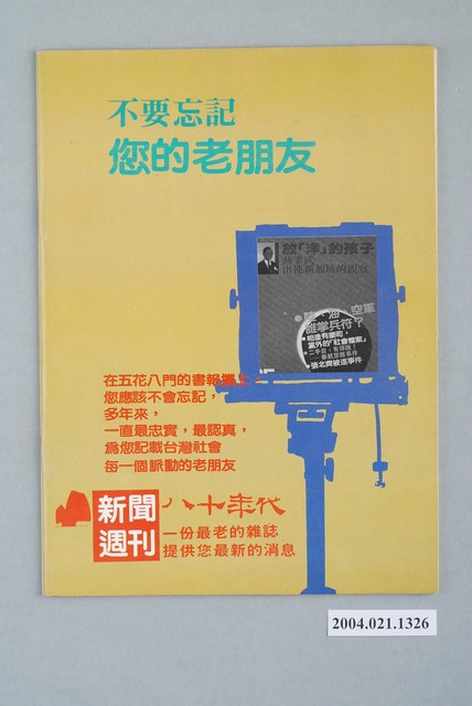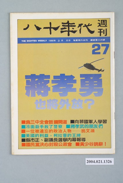 此為紙質雜誌,為1986年3月發行之《八十年代》週刊第27期(總號第104號)。本期封面內容計有〈蔣孝勇也將外放?〉、〈為三中全會鼓鑼開道〉、〈向菲國軍人學習〉、〈冷面殺手救了警察〉、〈蔣孝武的朋友們〉、〈一位被遺忘的政治人物――翁文灝〉、〈美國的利益、柯拉蓉的王牌〉、〈縣市正、副議長選舉內幕報導〉、〈國民黨決心封殺公政會〉、〈黃少谷請辭!〉等。目錄計有(一)封面裏:多病的俞內閣、(二)社評:不要把臺灣逼向火山口、(三)獨家新聞、(1)蔣孝勇何時外放?(徐文展)、(四)政治觀察、(1)蔣孝武的朋友們(胡木言)、(2)國民黨決心封殺公政會,為三中全會鼓鑼開道、(3)向菲國軍人學習,黃少谷請辭、(五)報紙看不到、(1)朱撫松部長說謊,劉宗翰應該回國謝罪、(2)張春男返美三週,表示將返回大陸定居、(3)對鄭周敏大搖其頭,菲律賓觀光部副部長訪臺、(4)芝加哥與大紐約區臺灣同鄉會分別舉辦「臺灣問題」研討會、(5)金旡怠自殺之死成謎,原是皇族後代,曾國藩的外戚、(6)國民大會召開祕密會議作成「一點結論」和「三點建議」、(7)「香港自救聯盟」向監院求救,有錢才能搞反共鬪爭活動、(8)省物資局爆發馬鈴薯弊案,高育仁胞弟涉嫌居中拉線、(9)許武勝調任省黨部,心仍戀棧外勤主管職務、(10)尤清主張縮減服役年限,監委諸公咸認「忤逆不道」、(六)國會側記、(1)「忘了我是誰」的于衡(關大功)、(七)國際政治、(1)美國的利益,柯拉蓉的王牌-兼論美軍基地遷移臺灣的可能性(魏明山)、(2)菲、韓反對黨「哥倆好」-論菲律賓和韓國的反對運動(邱國楨)、(八)粉墨春秋-人物篇、(1)一位被遺忘的政治人物-翁文灝-兼論國民黨的用人哲學(徐聞達)、(九)地方快報:縣市正副議長選舉特別報導、(1)國民黨隔岸觀火(張文秋)、(2)正、副議長「財人」輩出、(3)四年河東、四年河西-屏東縣議會選舉恩怨(何宜漢)、(4)台中訊:王世勛投下「扭轉乾坤」的一票,拒絕百萬誘惑,成為市民心中英雄、(5)彰化訊:白派許唯昌放棄對決,黨提名人選輕過關、(十)黨外佈告欄、(1)「紫藤蘆」官司纏身,周渝奮勇應戰、(2)黨外名醫洪奇昌走馬上任編聯會、(3)台權會三月份座談「交易自由與叛亂」、(十一)議會政治、(1)台北市議會預告片(洪新榮)、(2)從霧峰到檀香山-省議會內規會議報導(陳俊哲)、(十二)新聞話題、(1)大批黑官登場(宋別離)、(2)甲種特考,未映先轟動、(3)飛不動的華航(王真)、(4)從通識教育談教育自由(黃怡)、(5)以前盜印賺大錢,今後翻印有風險-國內西書市場的今昔變(廖政農)、(十三)財經、(1)不願畢業的臺灣-談一九八六年臺灣對美貿易的不利情勢(張懷德)、(十四)北京參考消息、(1)中共的禁衛軍-從政治派別看鄧小平以後的中共政局(郎郎)、(2)第二個香港-澳門(李中越)、(十五)特稿:走馬上任編聯會〈婦女節特稿〉、(1)從兩性平等看三項偽善的法律-寫在「新女性主義」三版之前(呂秀蓮)、(十六)壓卷人物、(1)冷面殺手殺了警察 等。 此件為康寧祥發行、江春男總編的《八十年代》雜誌,為臺灣黨外雜誌的重要代表,有「黨外雜誌編輯群的搖籃」之稱,由學者以及新聞界從事批判性的政論,與黃信介發行的《美麗島》雜誌成為「黨外政治」運動兩條路線各自的代表。所謂「黨外」為中國國民黨之外的政治勢力,「黨外」在國民黨政府的治下運用創辦雜誌的方式表達立場、對抗國民黨政府,這些雜誌、出版品被稱為「黨外雜誌」,《八十年代》亦是其中之一。最終,這股媒體趨勢在1986年民進黨成立、1987年解除戒嚴之後逐漸式微。