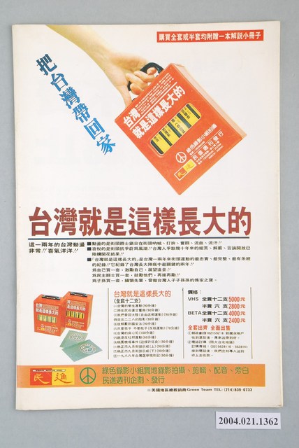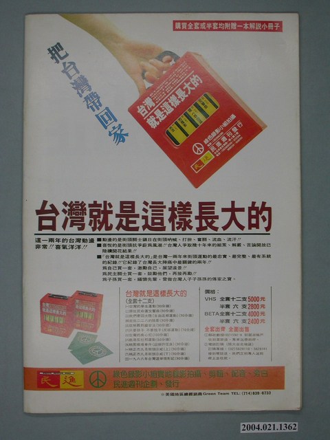 此為一紙質雜誌,此物件以相片為封面,邊框為紅黃綠三色,並以黃、紅字體標示物件之名稱,本物件為1987年10月發行之《民進週刊》第36號,封面內容計有〈林義雄修完哈佛再赴劍橋深造 林義雄競選第一任民選臺灣省長〉、〈那一夜,我們在調查局…〉、〈許信良行程漢城吳祥輝現場採訪最新報導〉、〈「新夫人派」鬥法李登輝〉、〈四十萬大軍瞄準許信良〉、〈施性忠十月廿八日出獄〉、〈黃信介赴美舉聖火〉、〈坪林職訓總隊總隊長林文明上校的鐵血煉獄〉、〈後勁居民包圍兪國華現場實況報導〉、〈財經首長炒作股票內幕〉等。目錄計有(一)民進觀點、(1)國民黨張燈結綵臺灣人目瞪口呆(蘇多)、(二)讀者進場編者候教、(1)核三廠飛出「不明飛行物」、(2)蔣總統喜歡走正門、(3)老法統與社會脫節、(4)「錢存」、「錢付」兄弟拍檔出手了、(5)向施性忠抗議、(6)施明德獄中來函訂閱民進周刊、(三)封面故事、(1)林義雄修完哈佛,再赴劍橋深造(吳哲朗)、(2)乾淨人格、內外一致的林義雄――林義雄小傳(衛揚)、(四)臺灣「光復節」特稿、(1)林義雄競選第一任臺灣省長(劉一德)、(五)特別報導、(1)坪林職訓總隊長林文明上校的鐵血煉獄(朱笠)、(2)林文明的「魔鬼傳奇」(朱笠)、(3)坪林居民談職訓總隊(朱笠)、(4)職訓總隊火警案死者家屬控告林文明、(六)蔣主席辦公室、(1)財經首長炒作股票內幕(陸平)、(2)立委積極審查「證券交易法」修正草案幕後、(3)「新夫人派」鬪法李登輝(林豪)、(4)國民黨「冒充」紅十字會、(5)關中拉攏李慶珠向李煥示好、(6)朱士烈請退,楊公邁呼聲甚高、(7)薛岳吃定青年黨、(七)臺灣來的、(1)本刊總編輯吳祥輝漢城採訪許信良行蹤最新報導(吳祥輝)、(2)四十萬大軍瞄準許信良(陸平)、(3)解嚴後警總繼續控制入出境安全工作鐵證、(4)民進黨對許信良回台事件的聲明、(八)身歷其境、(1)後勁居民包圍俞國華現場實況報導(莫蝶)、(2)警棍追趕十字架!――長老教會牧師聲援蔡有全、許曹德大遊行實況(莫蝶)、(3)許曹德;蔡有全獄中近況、(4)鳳山市民熱烈響應並聲援臺獨案、(5)「臺獨提案」讓民進黨牽腸掛肚(黃怡)、(九)五百暢談、(1)蔣經國出任「殘障同胞促進會」名譽理事長(陳奇)、(2)許信良空降回台(李三)、(十)一一一四民主聖火接力倒數計時、(1)黃信介赴美舉聖火!、(2)「民主聖火長跑」系列活動錄影帶即將問世、(3)去他媽的連環泡!(張無派)、(十一)特別報導、(1)那一夜,我們在調查局――香港青年梁啓賢、方偉鴻、謝黛霞、吳家立親筆控訴調查局全文照登(梁啓賢、方偉鴻、謝黛霞)、(十二)黃昏的故鄉、(1)吳豐山、徐璐、李永得「偽造文書」案開庭、(2)臺大校方準備封殺「臺灣前途」辯論會、(3)成大「西格瑪」社學生靜坐抗議、(4)施性忠出獄,新竹大團結、(5)台中市民消遣市長張子源、(6)十月廿八日,施性忠出獄 等。 《民進周刊》為1987年2月19日創刊的黨外雜誌,創辦人為吳祥輝。此刊物曾陸續以《民進時代》、《民進廣場》、《民進天地》、《民進世界》等名稱出版,最終在1990年8月20日停刊。此刊物標榜「不是機關報」、「人民第一、民進黨第二」,另《民進周刊》雖然在政治立場與民進黨親近,所謂「黨外」為中國國民黨之外的政治勢力,「黨外」在國民黨政府的治下運用創辦雜誌的方式表達立場、對抗國民黨政府,這些雜誌、出版品被稱為「黨外雜誌」,《民進周刊》系列亦是其中之一。