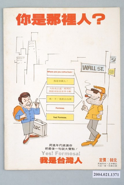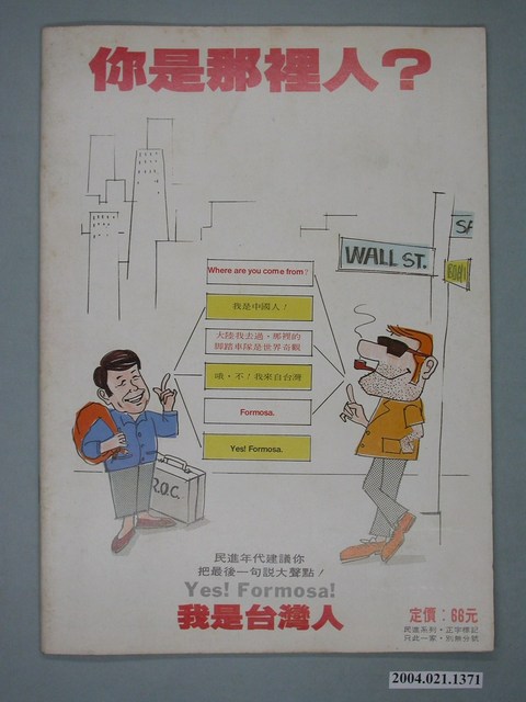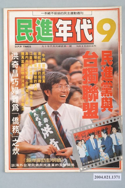 此為一紙質雜誌,此物件以相片為封面。本物件為1987年8月發行之《民進年代》週刊第9期(九十年代系列總號第82號),封面內容計有〈民進黨與臺獨聯盟〉、〈「唐山」過臺灣〉、〈「牛肉」就是民進黨〉、〈遠航搞金門的飛機〉、〈林棟是保守陣營的大將〉、〈江蓋世拜訪蔣緯國的一場大衝突〉、〈島內外齊心聲援「臺灣獨立」運動〉、〈陳萬富案證明林洋港的司法不獨立〉、〈洪奇昌巧婦難為「僑務」之炊〉、〈越洋專訪彭明敏――談海外臺灣同鄉與民進黨的互動關係〉等。目錄計有(一)最前線、(1)此時不獨立何時獨立?(蘇武)、(二)打開天窗說亮話、(1)不要老是玩替國民黨擦屁股的遊戲(本社)、(三)我們的天空、(1)樂了特權的「大家樂」、(2)把余傳韜、馮滬祥趕出校園、(3)加油陳水扁、(4)陳真來函照登、(四)最前線、(1)吳金贊才是「金馬獎」最佳編劇的得主-金馬青年抗議福建省政府始末(蔡九日)、(2)遠東航空搞金門的飛機(李木生)、(3)吳金贊形同傀儡、(4)槍桿子出政權-金馬居民是戒嚴魔掌下的遊魂(吳自然)、(五)特別企畫、(1)不要臉!-周下林代表萬年立委的大勝利(吳志仁)、(2)萬年立委全面大反撲(林水連)、(3)林棟為保守派重鎮(謝二郎)、(六)新聞法庭、(1)林洋港的司法死了(范道地)、(2)「三重幫」護航陳萬富(張揚)、(3)自立晚報大作陳萬富案的玄機(吳志仁)、(七)民主運動場、(1)民進黨綱中應列「人民有主張臺灣獨立的自由」(本社)、(2)各說各話、(3)士林夜市大車拼-江蓋世拜訪蔣經國衝突現場報導(范文雄)、(4)大家聲援「人民有主張臺灣獨立的自由」、(八)專題採訪、(1)民進黨與臺獨聯盟(本社)、(2)巧婦難為「僑務」之炊-專訪洪奇昌談「海外黨員入黨辦法」的決策流程(兵介仕)、(3)新潮流與編聯會系在民進黨中央的實際地位、(4)長老教會與民進黨的關係、(5)民進黨與臺灣婦女運動、(6)臺灣沒有真正的羣眾運動、社會運動、(7)洪奇昌對六一二事件的聲明、(8)海外臺灣人團體概觀(狷夫)、(9)聖火返鄉全力支持臺灣獨立-越洋專訪彭明敏(陳淑芳)、(10)民進黨的「鎖黨政策」-析論民進黨與海外團體的互動關係(蘇武)、(九)新聞現場、(1)江主席領軍示威中和市(林橫)、(2)自己市長自己選-八二○台北市民抗議市長官派示威遊行紀實(江要武)、(3)週末的狂熱-八二三大台北地區遊行大串連(林錦鍠)、(4)荼國春秋,烏龍戰爭-鹿谷鄉茶農首次的合法示威遊行、(5)臺南市黨部選舉內幕、(十)民進藍圖、(1)全面搶佔工會!-民進黨應落實「生產民主制」綱領(李直)、(十一)民進論壇、(1)牛肉就是民進黨-與張作錦一起炒牛肉(周病)、(十二)人權檔案、(1)司法開軍法的倒車,台權會探訪綠島監獄報告、(2)多少溫暖在鐵窗隔離下冷卻,十八位綠島政治犯共同聲明、(十三)陽光下、(1)楊力宇向康寧祥報到?、(2)中央社更正新聞的玄機、(3)中共迎合臺獨主張?、(4)簡又新封殺莊敬源(十四)立即反應、(1)唐山過臺灣-與陳唐山一席談(兵介仕)、(十五)政治三分球、(1)國安法是海盜法!(周病) 等。 此件《民進年代》雜誌為系列黨外雜誌其中之一,該系列有《九十年代》、《民進年代》、《領先週刊》等週刊,《民進年代》為純粹為民進黨新聞服務的雜誌,並期許為民眾帶來平實、客觀的報導,雜誌社的成員也都是民進黨的青年黨工,與當時期出版的《民進週刊》一樣都與民進黨有著密切關係,但反對並批評《民進週刊》運用女星做宣傳的策略。《民進年代》對民進黨逐漸以公職掛帥並遠離群眾的路線有所批評。 「黨外」一詞主要為非中國國民黨的臺灣政治勢力,而「黨外」政治勢力,主要的宣傳方式為「黨外雜誌」,「黨外雜誌」最早如1950年代的《自由中國》、1970年代的《大學》、《臺灣政論》,後在1980年代「黨外雜誌」發展蓬勃,代表刊物為《八十年代》與《美麗島》,最終,這股媒體趨勢在1986年民進黨成立、1987年解除戒嚴之後逐漸式微。「黨外雜誌」在當時激起了臺灣民眾的民主意識,也逐步促成了言論自由開放。(蕭淑玲,2006,153-155)。