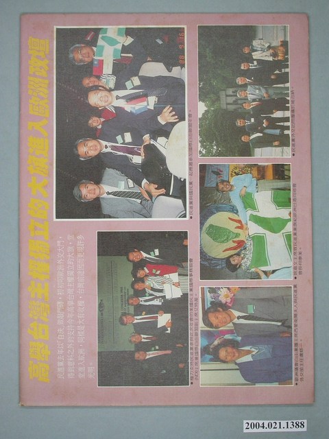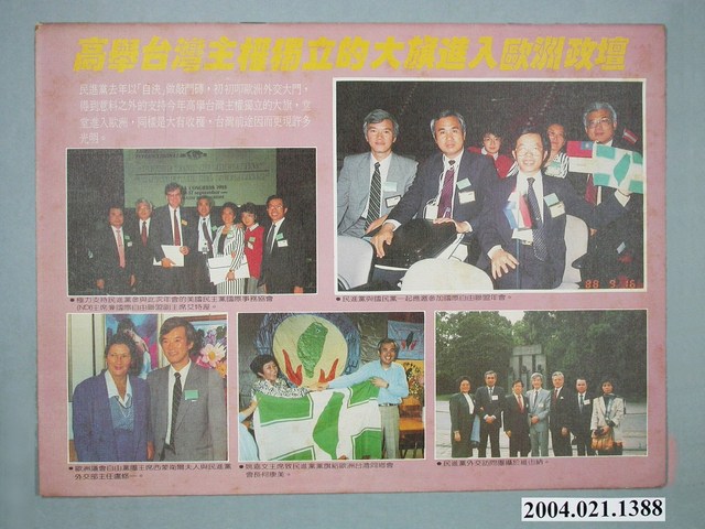此為一紙質雜誌,此物件以相片為封面,本物件為1988年10月發行之《民進報》週刊第30期(總號第81號),封面內容計有〈政黨外交打開臺灣出路――民進黨訪歐團收穫豐盛〉、〈國防部迫害本黨黨員!〉、〈中國時報暴力鎮壓產業工會〉、〈甲級統派的困境〉等。目錄計有(一)行動檔案、(1)全面推展跆拳道、(二)社論、(1)證所稅風暴檢驗國民黨執政資格、(三)焦點分析、(1)政黨外交打開臺灣出路-民進黨訪歐團收獲豐盛、(2)軍隊淪為國民黨的禁臠!、(2.1)陸軍上尉陳聲慶入黨的心路歷程、(2.2)中央黨部對國防部迫害本黨黨員事件發表緊急聲明、(四)現場報導、(1)高度參與感的黨員是黨的希望-「黨主席候選人政見發表會」顯現的意義、(2)歡樂滿遊園-黨慶園遊會熱絡活潑、(3)不自由的「自由派」大報-中國時報鎮壓產業工會現場報導、(五)漫畫、(1)魚夫版資治通鑑、(六)社會脈動、(1)政治特權與金錢遊戲-勞工眼中的股市風暴、(七)臺灣觀察、(1)另一個新的出發點-朱高正的聯邦模式、(2)拋棄歷史的臭汗衫-拒唱國歌、拒升國旗的改革意義、(八)海峽兩岸、(1)甲級統派的困境-再論胡秋原事件、(2)開放探親統戰組織大量出籠、(九)中央決議、(1)「公職候選人提名辦法草案」中常會討論熱烈、(十)民進之聲、(1)「亞洲觀察」理事拜會本黨、(2)學界將辦五二○事件說明會、(3)農權總會月底北上大遊行、(4)回扣將軍溫哈熊、(5)郝柏村玩特權,吳淑珍大追擊、(6)北美洲臺灣人教授協會由陳文彥教授接任會長、(十一)活動看板(封底裡) 等。 此件為民進黨於1988年創辦的《民進報》周刊,為民主進步黨的機關刊物,前身為1987年2月開始發行的《民進報》,總主筆為民進黨內部派系「新潮流」重要成員林濁水。《民進報》之創辦,據刊物的卷頭語所言,此刊物為民主進步黨對「報禁」的挑戰。(民主進步黨文宣部,1987。)《民進報》於1988年由報紙轉型為雜誌,其內容主要為時政評論、介紹民進黨相關事務以及社會運動宣傳。