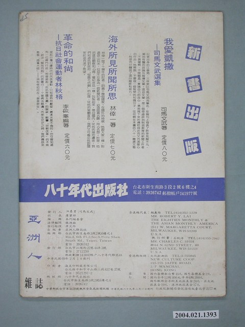 此為一紙質雜誌,此物件以白色為底,中間疊置紫色的臺灣地圖與帆船剪影,並以黑色字體標示物件之名稱,本物件為1980年3月發行之《亞洲人》月刊第1卷第2期(總號第2號),封面內容計有〈悼念林義雄先生家門慘變〉、〈政治事件審判的法律神話〉、〈訪陳若曦談高雄事件〉、〈臺灣與中共人權報告〉、〈選舉罷免法劄紀〉、〈再論治警事件〉等。目錄計有(一)血與愛(本社)、(二)編輯室筆記(編輯部)、(三)讀者投信、(四)特載、(1)最長的一日――記林義雄先生家門慘變(林南窗)、(2)牆裏.牆外(林濁水)、(2.1)高雄事件主要被告小傳、(2.2)高雄事件主要被告家屬動態、(3)訪陳若曦談美麗島事件(張文彥)、(五)台北話題(編輯部)、(六)專欄論述、(1)政治事件審判的法律神話――駁二月七日聯合報的一篇專訪(周渝)、(2)選舉罷免法劄記――行政院草案與無黨籍立委試擬案之比較(林世煜)、(3)職業革命家、社會運動家、政治改革家(黃煌雄)、(七)歷史.人物、(1)歷史的啓示――訪黃煌雄先生談「治警事件」(林進輝)、(2)余登發依舊關心政治(林應專)、(八)人權問題、(1)美國國務院臺灣人權報告(轉載)、(2)美國國務院中共人權報告(李迪仁譯)、(九)世界之窗、(1)印度的民主試驗――甘地夫人為何重掌政權(司馬文武)、(2)阿奎諾出獄前後――馬可仕獨裁政權陷於困境(江廉)、(十)中共問題、(1)魏京生案審判全文(轉載)、(十一)海外通訊、(1)對中國再統一的思慮(余英時作/康文雄譯)、(十二)議壇春秋、(1)行政院對康寧祥委員質詢之書面答覆(行政院)、(2)為高雄事件善後問題向行政院質詢(黃順興)、(3)國會聽政側記(陳川流)、(十三)書評書介、(1)介紹「革命的和尚」(李筱峰)、(十四)醍醐小品、(1)默契(莊理子)、(2)誰最民主(李竹山)、(3)熱帶魚(胡生)、(十五)藝苑夜話、(1)文明併發症――從「中國併發症」談起(韓良露)、(十六)本期漫畫(康文雄譯) 等。 此件《亞洲人》為康寧祥發行的《八十年代》雜誌的系列刊物之一,主要為接替《八十年代》而創刊,《八十年代》系列雜誌為臺灣黨外雜誌的重要代表,有「黨外雜誌編輯群的搖籃」之稱,由學者以及新聞界從事批判性的政論,與黃信介發行的《美麗島》雜誌成為「黨外政治」運動兩條路線各自的代表。所謂「黨外」為中國國民黨之外的政治勢力,「黨外」在國民黨政府的治下運用創辦雜誌的方式表達立場、對抗國民黨政府,這些雜誌、出版品被稱為「黨外雜誌」,《亞洲人》亦是其中之一。