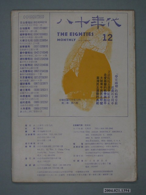 此為一紙質雜誌,此物件以綠、黃相間之亞洲地圖及紫色帆船之剪影為封面,並以紅色字體標示物件之名稱,本物件為1981年7月發行之《亞洲人》月刊第1卷第3期(總號第3號、復刊號)。目錄計有(一)發刊辭、(1)八十年代的亞洲人、(二)專欄論述、(1)政黨政治的世界發展和在台現勢(陶百川)、(2)對殷海光先生的一段懷念(傅正)、(3)「建國政黨」的問題(李南雄)、(4)從立法院新形象談起(康寧祥)、(三)新聞自由、(1)報紙與新聞(司馬文武)、(2)痛話報禁(金吾)、(四)國際問題、(1)浪淘盡多少風雲人物(顧京譯)、(2)柬埔寨反越運動(沙末)、(五)東京通訊(王清文)、(1)開發乎?保存乎?、(2)創造學習的環境、(3)伊東震撼、(4)華勒沙訪日、(六)香港通訊(張夢珊)、(1)上海青年在新疆、(2)租借期滿何處去、(3)三邊會議在大陸、(七)文化思想、(1)亞洲哲學的現代風貌(廖仁義)、(八)文學藝術、(1)民主與國寶(林怡安)、(2)臺灣民謠餘響(高文娟)、(九)教育、(1)建立契約人權的觀念(江揚)、(十)時事評論、(1)論呆帳的是非(張清正)、(2)自強號電聯車三部曲(荀孫)、(3)我看台北市里長選舉(康水木)、(十一)議會政治、(1)可憐的省議會(唐理言)、(2)國會散記(康園)、(十二)社會、(1)無助的控訴(王森玉)、(2)有「雨」問蒼天(陳火旺)、(十三)歷史、(1)新莊拓墾者的真貌(林思源)、(十四)愚園閒話、(1)給獄中友人的一封信(黃順興)、(2)勞動節的感想(黃順興)、(十五)人物、(1)臺灣民主政治的典範――記李萬居先生(蔡憲崇)、(十六)幽默、(1)國會新生訓練班(潘榮禮)、(2)悄悄話外交(康文雄譯)、(十七)漫畫、(1)進入藝術堂奧的政治漫畫(陳浩)、(2)CoCo揮筆――阿歪從政記等(CoCo)、(3)PIC、(十八)編輯室筆記 等。 此件《亞洲人》為康寧祥發行的《八十年代》雜誌的系列刊物之一,主要為接替《八十年代》而創刊,《八十年代》系列雜誌為臺灣黨外雜誌的重要代表,有「黨外雜誌編輯群的搖籃」之稱,由學者以及新聞界從事批判性的政論,與黃信介發行的《美麗島》雜誌成為「黨外政治」運動兩條路線各自的代表。所謂「黨外」為中國國民黨之外的政治勢力,「黨外」在國民黨政府的治下運用創辦雜誌的方式表達立場、對抗國民黨政府,這些雜誌、出版品被稱為「黨外雜誌」,《亞洲人》亦是其中之一。