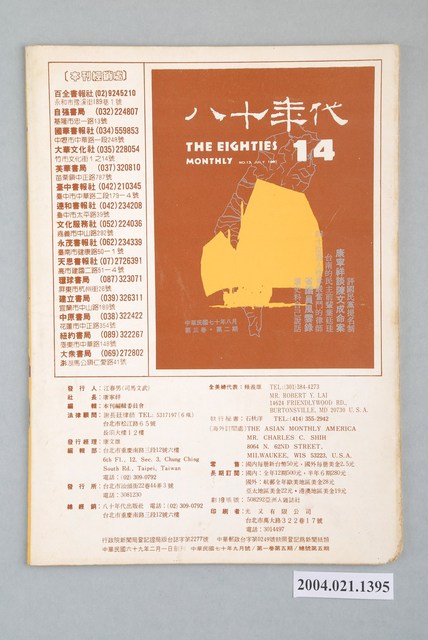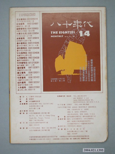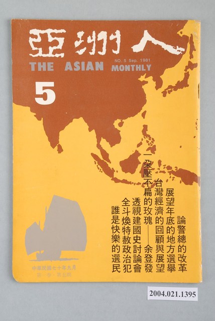 此為一紙質雜誌,此物件以棕、黃相間之亞洲地圖及灰色帆船之剪影為封面,並以白色字體標示物件之名稱,本物件為1981年9月發行之《亞洲人》月刊第1卷第5期(總號第5號),封面內容計有〈論警總的改革〉、〈展望年底的地方選舉〉、〈臺灣經濟的回顧與展望〉、〈一朵壓不扁的玫瑰――余登發〉、〈透視建國史討論會〉、〈全斗煥特赦政治犯〉、〈誰是快樂的選民〉等。目錄計有(一)社論、(1)維護學術自由、(二)編輯室筆記、(三)讀者投書、(四)國內政治、(1)展望年底的地方選舉(編輯部)、(2)誰是快樂的選民(莊守義)、(3)高雄市議員選舉面面觀(吳郎)、(4)論警總的改革(蔣良任)、(5)無意義的法律(張德銘)、(6)立法院奇人誌(張火旺)、(五)建國史專題、(1)透視建國史討論會(李台生)、(六)台北話題、(1)聯合月刊的身段、(2)林金生的政治黃連、(3)迷航與空難、(4)文藝團體應打開門戶、(5)李敖的書、(6)聯合報卅年社慶、(七)亞洲政情、(1)金斗煥大赦千餘犯人(洪鐮德)、(2)漢城˙一九八一年夏(郭學文)、(3)林吉祥的民主行動黨(巴閉)、(八)東京通訊(王清文)、(1)「金脈集團」出擊、(2)日共政綱成立二十周年、(3)須之部談日本外交、(4)海外日僑問題、(5)關西財界大動盪、(九)香港通訊、(1)爭明日報停刊內幕(顧京)、(十)國濟問題、(1)戰爭何其多?(資料室)、(十一)經濟、(1)臺灣經濟的回顧與展望(蔡憲崇)、(十二)醫療、(1)重視「醫療人權」(陳永興)、(十三)報導、(1)台北市人喝什麼水?(林惠菁)、(十四)思想、(1)自由、民主與倫理(韋政通)、(十五)人物、(1)一朵壓不扁的玫瑰――余登發(蔡憲崇)、(十六)短評、(1)遊子遊感沒有誠意的人(黃竹)、(十七)詩、(1)誰能測量福爾摩沙(宋澤萊)、(十八)漫畫、(1)CoCo漫畫(CoCo) 等。 此件《亞洲人》為康寧祥發行的《八十年代》雜誌的系列刊物之一,主要為接替《八十年代》而創刊,《八十年代》系列雜誌為臺灣黨外雜誌的重要代表,有「黨外雜誌編輯群的搖籃」之稱,由學者以及新聞界從事批判性的政論,與黃信介發行的《美麗島》雜誌成為「黨外政治」運動兩條路線各自的代表。所謂「黨外」為中國國民黨之外的政治勢力,「黨外」在國民黨政府的治下運用創辦雜誌的方式表達立場、對抗國民黨政府,這些雜誌、出版品被稱為「黨外雜誌」,《亞洲人》亦是其中之一。