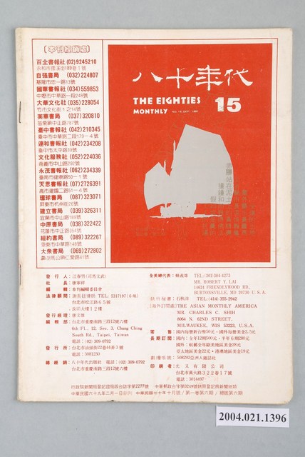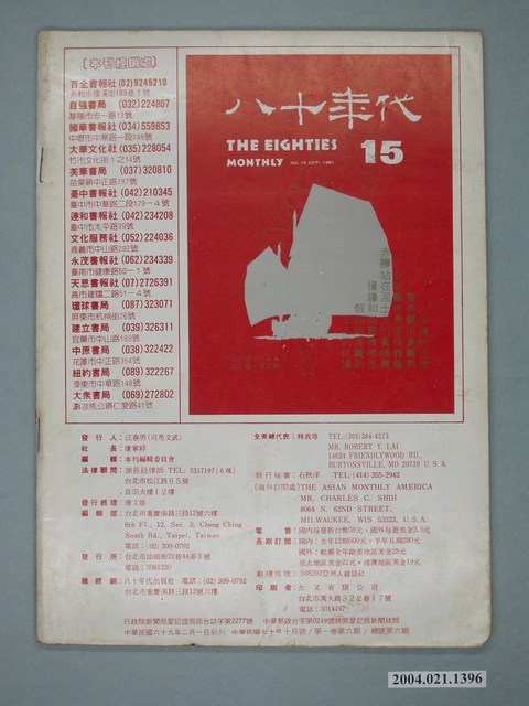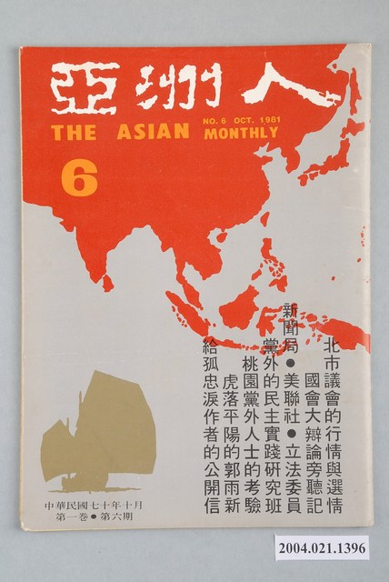 此為一紙質雜誌,此物件以紅、灰相間之亞洲地圖及米色帆船之剪影為封面,並以白色字體標示物件之名稱,本物件為1981年10月發行之《亞洲人》月刊第1卷第6期(總號第6號),封面內容計有〈北市議會的行情與選情〉、〈國會大辯論旁聽記〉、〈新聞局•美聯社•立法委員〉、〈黨外的民主實踐研究班〉、〈桃園黨外人士的考驗〉、〈虎落平陽的郭雨新〉、〈給狐忠淚作者的公開信〉等。目錄計有(一)社論、(1)我們對中國統一問題的基本態度、(二)編輯室筆記、(三)讀者來函、(四)目錄、(五)議會政治、(1)「兩成事件」所顯示的政治問題(張德銘)、(2)打開政治的「死結」(許榮淑)、(3)政府為什麼不受信任(鍾榮吉)、(4)大小報告的壞處(紀政)、(5)如何紀念臺灣抗日英烈(黃煌雄)、(6)正視臺灣先民的貢獻(張立民)、(7)新聞局不應取消美聯社記者登記證(康寧祥等)、(8)國會大辯論旁聽記(莊慕德)、(9)國會短評(蘇和)、(六)選舉、(1)台北市議會的行情與選情(陳立民)、(2)再一次的考驗(許榮和)、(3)黃順興是怎樣去選擇的?(黃順興)、(4)黨外及違紀競選縣市長者的仕途宦海(黃維正)、(七)台北話題、(1)家博的悲觀、(2)沈劍虹的幽怨、(3)黨外「民主實踐研究班」、(4)空降部隊的轎子理論、(5)警總歡迎美國專家、(6)陳鼓應有國歸不得、(7)孤忠淚的迴響、(8)政治上的沈大公子、(9)新聞局的模範刊物、(八)新聞自由、(1)新聞自由的場內戲(賴祖義)、(2)周清月的故事(魏晴文)、(3)美聯社為周清月辯護(吳達然譯)、(4)錯誤與不負責的報導(魏如風)、(5)奇怪的新聞信條(胡佳澤)、(九)專訪、(1)康寧祥與謝長廷民主對話錄(蕭夫)、(2)一個國民黨基層幹部的控訴(謝進發)、(3)民主時代的忠君思想(李怡仁)、(十)國際問題、(1)沙達特鎮壓異己(洪鐮德)、(十一)勞工、(1)司機「賺吃」真艱苦(林惠菁)、(十二)文藝、(1)沒有寫完的詩(江河) 等。 此件《亞洲人》為康寧祥發行的《八十年代》雜誌的系列刊物之一,主要為接替《八十年代》而創刊,《八十年代》系列雜誌為臺灣黨外雜誌的重要代表,有「黨外雜誌編輯群的搖籃」之稱,由學者以及新聞界從事批判性的政論,與黃信介發行的《美麗島》雜誌成為「黨外政治」運動兩條路線各自的代表。所謂「黨外」為中國國民黨之外的政治勢力,「黨外」在國民黨政府的治下運用創辦雜誌的方式表達立場、對抗國民黨政府,這些雜誌、出版品被稱為「黨外雜誌」,《亞洲人》亦是其中之一。