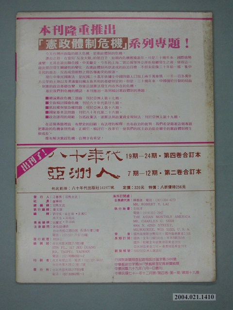 2004.021.1410 亞洲人雜誌社發行《亞洲人》月刊第4卷第1期總號第19號