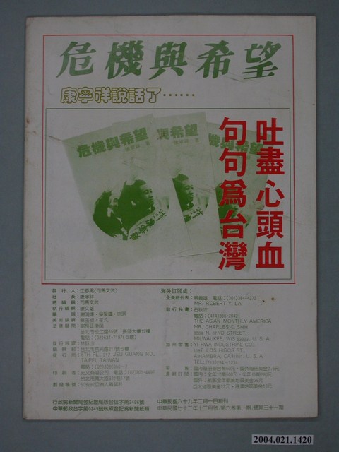 此為一紙質雜誌,此物件以相片為封面(中央置有插圖),並以紅色描邊字體標示物件之名稱,本物件為1983年12月發行之《亞洲人》月刊總號第31號,本期主題為「專號:選戰•自決•黨外」,封面內容計有〈中•台•港的政治癥結〉、〈談「自決」構不構成煽惑罪?〉、〈政客與政治發展〉、〈黨外•議會•群眾〉等。目錄計有(一)社論、(1)臺灣的命運、(二)讀者投書、(三)編輯室筆記、(四)台北話題、(1)黨外的共同政見、(2)天上掉下來的助選員、(3)特赦林義雄的呼聲、(4)佛光山助選總部、(5)選舉活動的新聞報導、(五)政治、(1)中˙台˙港的政治癥結――亞洲的政治文化(邱垂亮)、(六)專號:自決˙選舉˙黨外(本刊編輯部)、(1)自決、(1.1)學者專家談「自決」、(1.2)談「自決」構不構成煽惑罪(蔡墩銘)、(1.3)「自決」是一種權利(張旭成)、(1.4)黨外候選人的「自決」政見(馬非白等)、(2)選舉、(2.1)這一仗是怎麼打的?(羅思遠)、(2.2)談「今年的選舉」(胡晴羽等)、(3)黨外、(3.1)黨外˙議會˙群眾――探索黨外本土民主運動的方向與方法(黃森松)、(3.2)政客與政治發展(江炳倫)、(七)議會政治、(1)黨外鐵三角的「農民之聲」(陳劍平)、(八)短評、(1)「月亮與烏鴉」(江雪)、(九)國際政情、(1)雷根在格島戰事的敗筆(郭美謹)、(2)九七以前的香港政治動向(齊辛)、(3)日本對中國的研究(柳瑩)、(十)人物、(1)民主主義的文化鬪士――王白淵(謝里法)、(十一)政治思潮、(1)馬基雅維利的霸術論(藍明玉) 等。 此件《亞洲人》為康寧祥發行的《八十年代》雜誌的系列刊物之一,主要為接替《八十年代》而創刊,《八十年代》系列雜誌為臺灣黨外雜誌的重要代表,有「黨外雜誌編輯群的搖籃」之稱,由學者以及新聞界從事批判性的政論,與黃信介發行的《美麗島》雜誌成為「黨外政治」運動兩條路線各自的代表。所謂「黨外」為中國國民黨之外的政治勢力,「黨外」在國民黨政府的治下運用創辦雜誌的方式表達立場、對抗國民黨政府,這些雜誌、出版品被稱為「黨外雜誌」,《亞洲人》亦是其中之一。