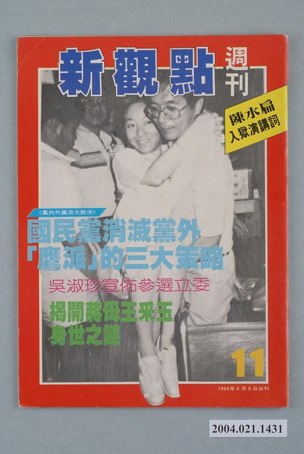 此為一紙質雜誌,在封面上方寫有本書標題,並在封面刊有陳水扁以及吳淑珍的照片,並節錄本刊物的部份內容,右下為雜誌期號,背面則刊有「輪椅行軍」街頭活動的照片。此書為新觀點週刊雜誌社1986年出版的《新觀點週刊》第11號。 此物件為在1986年創辦的《新觀點》系列雜誌其一,創辦人為陳世傑,為批判政府的黨外雜誌其一,此雜誌目的是要興辦突破戒嚴的言論審查、貫徹言論自由,並如同該刊物的創辦語「縮頭是一刀,伸頭也是一刀」的覺悟敢論敢言。此雜誌的特色為陳水扁每期皆為其撰寫社論,而陳水扁為臺灣近代社會運動的重要人物之一,以美麗島大審的辯護律師發跡,並在「蓬萊島案」及一系列的事件中扶搖直上,並先後擔任立法委員、臺北市長及中華民國第10、11任總統。後因貪汙案導致陳水扁入獄。 「黨外」一詞主要為非中國國民黨的臺灣政治勢力,而「黨外」政治勢力,主要的宣傳方式為「黨外雜誌」,「黨外雜誌」最早如1950年代的《自由中國》、1970年代的《大學》、《臺灣政論》,後在1980年代「黨外雜誌」發展蓬勃,代表刊物為《八十年代》與《美麗島》,最終,這股媒體趨勢在1986年民進黨成立、1987年解除戒嚴之後逐漸式微。「黨外雜誌」在當時激起了臺灣民眾的民主意識,也逐步促成了言論自由開放。(蕭淑玲,2006,153-155)。