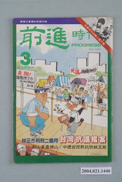 此為一紙質雜誌,此物件以插圖為封面,並以綠色字體標示物件之名稱,本物件為1984年1月發行之《前進時代》週刊第3期,封面內容計有〈林正杰判刑二個月〉、〈臺灣抗議檔案〉、〈梨山果農燒山〉、〈中壢居民對抗欣桃瓦斯〉等。目錄計有(一)吾土吾民、(1)封面裏、(1.1)我們不要和炸彈睡在一起!、(1.2)林正杰判刑二個月!、(二)社論、(1)用快樂的方式,抗議讓我們至深的忿怒、(三)封面故事、(1)我們不要跟炸彈睡在一起(陳素香)、(2)梨山果農事件始末(賢武)、(3)憤怒之火(江長嘯)、(4)臺灣抗議檔案(黃嘉光)、(四)特別報導、(1)活著走出綠島(張芳)、(2)述懷(詩)――為囚禁綠島三十年的政治犯而作(鍾喬)、(五)前進論壇、(1)保護作者就是保護言論自由(林正杰)、(2)黨外選誰黨總統(趙常)、(3)不乖,就要打手心――有關學生「申訴權」的爭議(黎普)、(4)年年難過,年年過――黨外雜誌消息四則(溪蓮)、(5)中共,南韓的體育交流、(6)部長˙老闆˙洋顧問――台塑水泥廠的風風雨雨(趙得住)、(7)一簍簍的傷心和目屎(蘇格拉高)、(8)侯德健又說話了、(9)滿街都是毒氣――全世界汽油加鉛的真相(胡志拓)、(10)從二項決策看考政當局的欺軟怕硬(友直)、(六)前進短打、(1)臺灣不急,急死美國(高次山)、(2)失業工人與黨外前途(吳勝夫)、(3)用護照控制言論(郭吉仁)、(4)問題滿籮筐,傷心話教育(非馬)、(七)首都別記、(1)陳若曦到台北、(2)謝謝關我卅年、(3)岌岌可危的法律制度、(4)「在室男」的「處女作」、(八)大城小調、(1)花東地區的新希望、(2)郭麗莉,黃壽美挨告、(3)軍機保險嗎?、(九)外國月亮、(1)全世界最富裕的新國家――汶萊、(2)蘇聯學童日子不好過了、(3)韓國女性的覺醒、(4)搖搖欲墮的以色列夏米爾政府、(5)誰殺了艾奎諾、(十)新聞穿梆、(1)中國時報幹上尤清、(2)中山信徒坑了中山樓、(3)中國時報穿梆孫運璿、(4)中船打腫臉充胖子、(5)大華晚報先聲奪人、(十一)讀者來函、(十二)本周之最 等。 此物件為林正杰創辦的《前進》雜誌系列出版品之一,為黨外政論雜誌,曾受國民黨政府查禁,並陸續更改刊名,計有《前進周刊》、《前進廣場》、《前進時代》、《前進世界》等。《前進》雜誌標榜「在報禁下尋找更接近真實的客觀報導」,其重要創辦人有林正杰、蔡式淵、蔡仁堅,三人皆為民進黨早期派系「前進系」成員。所謂「黨外」為中國國民黨之外的政治勢力,「黨外」在國民黨政府的治下運用創辦雜誌的方式表達立場、對抗國民黨政府,這些雜誌、出版品被稱為「黨外雜誌」,《前進》系列亦是其中之一。