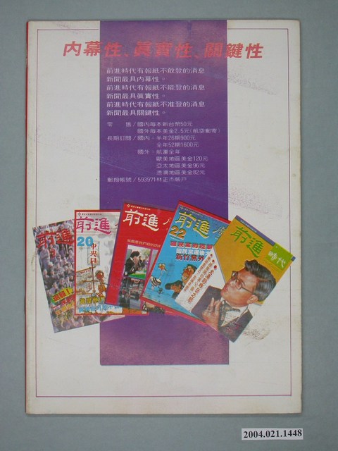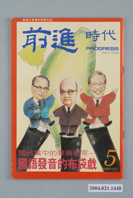 此為一紙質雜誌,此物件以插圖為封面,並以藍色字體標示物件之名稱,本物件為1984年2月發行之《前進時代》週刊第5期,封面內容計有〈國民黨中的臺籍政客――國語發音的布袋戲〉等。目錄計有(一)吾土吾民、(1)封面裡:接班!接班!、(2)封底裡:臺灣文學新展望、(二)封面故事、(1)國語發音的布袋戲――國民黨中的台籍政客(嚴凱)、(2)水水水的謝東閔(水情專家)、(三)特別報導、(1)國民黨第一怕――高雄虎王玉雲(小生)、(2)陳田錨與王玉雲大鬪法(馬非白)、(四)前進論壇、(1)還好他們不是國大代表――黨外省議員敦請蔣經國連任總統?(黃嘉光)、(2)「軍機」不可洩漏(黎普)、(3)陳守山看著辦!――接露退休警總上校父子涉嫌詐騙案(吳祥輝)、(4)電視臺裡的怪異現象(巨星吉)、(5)雖小國,亦有可觀――陳水扁談中美洲見聞(高次山整理)、(6)賴和平反演講會(溪蓮)、(7)入世的工人作家――論述楊青矗的小說(高天生)、(8)香港政府處理騷亂事件的經驗(冰谷)、(9)議場齷齪的商業談判(文雅)、(10)醫生與臺灣政壇的變遷(高維正)、(五)首都別記、(1)國大會前糗事連篇、(2)國民黨新春狂想曲、(3)紐約同鄉發起回鄉運動、(4)反共義「鳥」起飛來歸、(5)周清玉為競選主席團拉票、(六)大城小調、(1)博觀雜誌二月下旬復刊、(2)臺灣文學的昨日、今日、明日、(3)黨外作家編輯聯誼會將修改章程、(4)尤清照幹!、(5)都是綠島所賜、(6)高雄黨外舉辦燈謎晚會、(七)電影論衡、(1)影展熱(李立)、(2)天真、理想主義的「家庭主夫」(何雨鑑)、(3)浩劫後(陳奇)、(八)外國月亮、(1)將軍與勳章、(2)埃及禁了美國影集、(3)尼克森的「最後審判」、(4)鐵娘子的「特權」、(5)西德下決心改用無鉛汽油、(6)辦公室的電子世界、(九)新聞穿梆、(1)聯合報追新聞慢半拍、(2)電話監聽侵害人權、(3)光復會不務正業、(4)聯合、中時仍然不誠實、(5)中央社扭曲時代雜誌、(6)有名就是同胞、(7)可惜的自由日報、(十)本周之最、(十一)讀者來函 等。 此物件為林正杰創辦的《前進》雜誌系列出版品之一,為黨外政論雜誌,曾受國民黨政府查禁,並陸續更改刊名,計有《前進周刊》、《前進廣場》、《前進時代》、《前進世界》等。《前進》雜誌標榜「在報禁下尋找更接近真實的客觀報導」,其重要創辦人有林正杰、蔡式淵、蔡仁堅,三人皆為民進黨早期派系「前進系」成員。所謂「黨外」為中國國民黨之外的政治勢力,「黨外」在國民黨政府的治下運用創辦雜誌的方式表達立場、對抗國民黨政府,這些雜誌、出版品被稱為「黨外雜誌」,《前進》系列亦是其中之一。