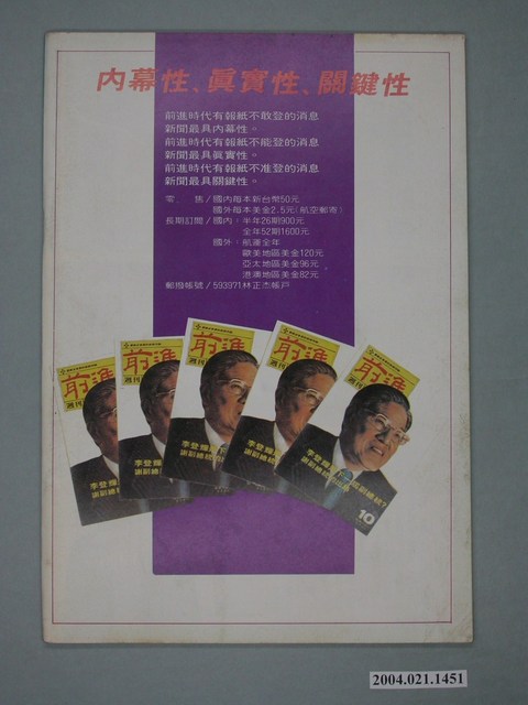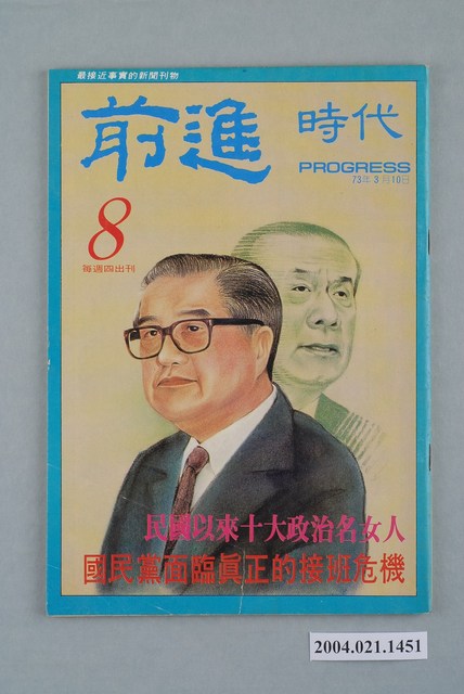 此為一紙質雜誌,此物件以插圖為封面,並以藍色字體標示物件之名稱,本物件為1984年3月發行之《前進時代》週刊第8期,封面內容計有〈民國以來十大政治名女人〉、〈國民黨面臨真正的接班危機〉等。目錄計有(一)吾土吾民、(1)封面裡:禁!不准看、不准聽、不准寫!、(2)封底裡:悲痛的控訴、(二)社論、(1)後二二八的沉思、(三)封面故事、(1)蔣經國的頭痛時間-國民黨面臨真正接班危機(徐策)、(2)蜀中無大將,彥士見風漲(何慧)、(四)特別報導、(1)民國以來十大政治名女人(陳醉)、(2)「新女性」對抗「性奴隸」――期待一個屬於女性的反抗運動(汪立峽)、(五)前進論壇、(1)開棺驗屍――吞金案出現高潮(姚國建)、(2)辜偉甫擺烏龍、蔡辰洲耍黃牛――中華民俗藝術基金會遇人不淑(吳祥輝)、(3)悲痛的控訴――追悼林家婆孫死難四週年(本刊資料)、(4)安民乎?擾民乎?(平天下)、(5)「意願」與「願意」――胡耀邦邏輯不及格(余從哲)、(6)都是魏鏞惹的禍――「多體制國家」理論攻防戰(高次山)、(7)黨外要大氣,要以主人自居――傳遞一個信息(一)(林波海)、(8)舶來「危險品」大傾銷――西方國家對第三世界的傾銷罪行(胡志拓)、(9)不妥協的漁夫――高學漁船船員工會籌組奮鬥記(馬非白)、(六)首都別記、(1)孫運璿病倒河北幫頓失靠山、(2)毛松年官職不保、(3)「七十年代」將改名「九十年代」、(4)國民黨文工會欲整肅黨外雜誌、(七)大城小調、(1)王玉雲兄弟勢大遭忌、(2)八三年十大婦女新聞、(3)聯誼會將修改章程、(4)巫義德想選總統、(5)許榮淑尤清台中服務處排定一系列演講、(6)真心話雜誌連吃官司、(八)外國月亮、(1)母子離散四十年、(2)日本「社會大學」矯客、(3)階級鬥爭?顧客乎爭鬥乎?、(4)中共、韓國網球傳情、(5)牛牽到難民營還是牛、(九)新聞穿梆、(1)中央日報陷人不義、(2)台時替美國賣石油、(3)聯合報肉麻兮兮、(4)自由日報編輯水準太差、(5)中時曲解國父思想、(十)讀者來函、(1)聯合報又在喊口號、(十一)本周之最 等。 此物件為林正杰創辦的《前進》雜誌系列出版品之一,為黨外政論雜誌,曾受國民黨政府查禁,並陸續更改刊名,計有《前進周刊》、《前進廣場》、《前進時代》、《前進世界》等。《前進》雜誌標榜「在報禁下尋找更接近真實的客觀報導」,其重要創辦人有林正杰、蔡式淵、蔡仁堅,三人皆為民進黨早期派系「前進系」成員。所謂「黨外」為中國國民黨之外的政治勢力,「黨外」在國民黨政府的治下運用創辦雜誌的方式表達立場、對抗國民黨政府,這些雜誌、出版品被稱為「黨外雜誌」,《前進》系列亦是其中之一。