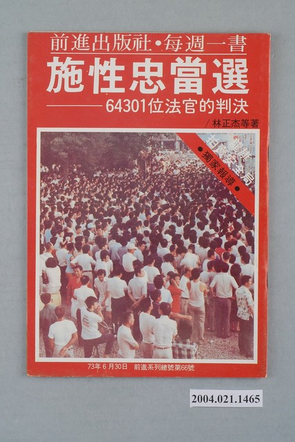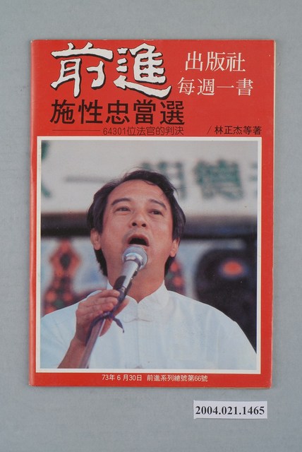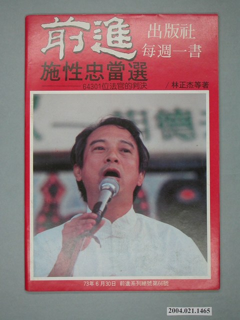 此為一紙質刊物,此物件以插圖為封面,並以白色字體標示物件之名稱,本物件為1984年6月發行之「前進雜誌社•每週一書」(前進總號第66號),書名為《施性忠當選――64301位法官的判決》,林正杰等著。目錄計有(一)、封面故事、(1)施性忠當選(葉小虹)、(2)新竹市民肯定施性忠的人格(本刊記者)、(3)6月23日-施性忠日-新竹市長補選選情分析(林水靜)、(4)施性忠出題˙國民黨頭痛(韋明)、(5)歷史性的抗議怪傑-訪問施性忠(吳祥輝)、(二)前進短打、(1)黨外新合作主義的誕生-施性忠開創法律鬥爭模式(李樵)、(三)獨家內幕、(1)《龍旗》拍賣《安全局》-勞政武詐欺、汪敬煦難為(郭年)、(四)海外文摘、(1)先香港˙後臺灣-中共對台統戰的新策略(齊辛)、(五)前進論壇、(1)立法委員「不是鬼」?-立法院的銅臭味(張知本)、(2)市議員的發財學-看台北市議會如何自清(陳近南)、(3)邱連輝差點掉進警總的陷阱(小兵)、(六)特別報導、(1)黑暗之死-海山煤礦大災變(王水水)、(2)為山地而歌-山地歌謠演唱會記實(王水水)、(3)臺灣的「一等國民」-李建興家族的盛衰(南天宮)、(七)傳達一個訊息、(1)臺灣是大家的國土(林波海)、(八)熱門話題、(1)法界兩怪為許昆龍鬥法(廖天)、(2)打老虎或打老鼠(姚國建)、(九)本周之最、(十)首都別記、(1)馬英九大煞黨工風景、(2)蔣孝武突圍失敗、(3)馬紀壯呷緊弄破碗、(4)蔣彥士與俞國華分庭抗禮、(5)邱創煥讓人看破手腳、(十一)黨外頻道、(1)黨外公政會重要人事定案、(十二)外國月亮、(1)世界首創的點字鈔票、(2)乒乓球的妙用、(3)印度國家血洗黃金寺廟、(4)嬰兒哭聲的六腳母牛、(5)我的家在山的那一邊、(十三)環球一週、(十四)前進之聲 等。 此物件為林正杰創辦的《前進》雜誌系列出版品之一,為黨外政論雜誌,曾受國民黨政府查禁,並陸續更改刊名,計有《前進周刊》、《前進廣場》、《前進時代》、《前進世界》等。《前進》雜誌標榜「在報禁下尋找更接近真實的客觀報導」,其重要創辦人有林正杰、蔡式淵、蔡仁堅,三人皆為民進黨早期派系「前進系」成員。所謂「黨外」為中國國民黨之外的政治勢力,「黨外」在國民黨政府的治下運用創辦雜誌的方式表達立場、對抗國民黨政府,這些雜誌、出版品被稱為「黨外雜誌」,《前進》系列亦是其中之一。