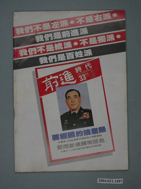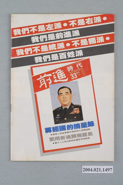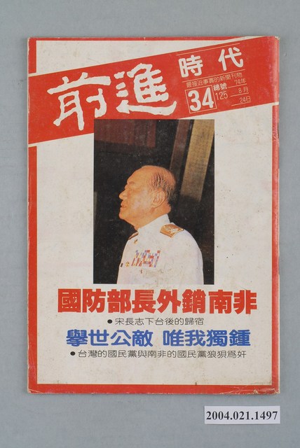此為一紙質雜誌,此物件以白色為底,中央置有照片,並以白色字體標示物件之名稱,本物件為1985年8月發行之《前進時代》週刊第34期(總號第125號),封面內容計有〈國防部長外銷南非――宋長志下台後的歸宿〉、〈舉世公敵唯我獨鍾――臺灣的國民黨與南非的國民黨狼狽為奸〉等。目錄計有(一)封面故事、(1)國防部長外銷南非-宋長志下台後的歸宿和臺灣與南非的軍事勾搭(水情專家)、(2)白色獨裁下的黑人-臺灣應當關切南非種族隔離問題(林亞明)、(3)與世公敵,我情獨鍾-世界特國制裁南非的做法(王東烈)、(4)革命前夕的南非-南非掃「黑」黑人抗暴現狀(王費台)、(5)不買白人的商品-南非黑人展開有效的大規模反抗運動(王開)、(二)熱門話題、(1)十四億鉅額貸款的超級大戶名單-十三兄弟細說從頭(柳木天)、(三)前進報導、(1)卜少夫在傳達什麼訊息(郭紀)、(2)一個陌生男子的來電(鍾楚紅)、(3)突破言論禁忌的豐收年-《一九八四黨外文選》決選得獎名單(汪兆同)、(4)總統召見輪不到議員質詢-高雄市議會炮轟蘇南成的小鬥幫大忙(莊和)、(四)選情快報、(1)選將特寫:尤清競選的三個條件(朱自河)、(2)選情特寫:背水一戰的何春木-台中市的選前大戰(正雄超)、(3)兵不厭詐:關中將兵三萬,陳金讓花錢催票(陳墾)、(4)選區風雲:省議會的前塵舊夢(黃維正)、(5)選舉併發症:沒有暴動的鎮暴-高雄實行大規模選前鎮暴演習(馬非白)、(6)選舉併發症:百無一枝的台北梅花-國民黨的「選舉算命學」(郭單)、(五)特別報導、(1)日航第一-日航空難及處置經過(王芸)、(2)遠航第幾?-遠航空難及處置經過(姚國建)、(六)電影論衡、(1)大塊假我以電影,陽春招我以場景-邵氏公司北望中原(馬武)、(2)滿紙中國大陸,一把無法預知-再探劉家昌回歸大陸之說(葉凡)、(七)人物專訪、(1)品頭論足話「經國」-訪「政治相士」謝坤銓(平平)、(八)本週之最、(九)前進之聲、(十)首都別記、(1)戴立寧辭職抗議、(2)陸潤康暴投,錢純救援上場、(3)「新右派」漸露頭角、(4)龍旗雜誌推銷術翻新、(5)黨外民主實踐研究班即將開鑼、(6)宜蘭人士追思郭雨新、(十一)海外與大陸、(1)美日兩國決戰中國大陸、(2)紅旗轎車將陸續外銷、(3)大陸的流行服飾革命、(4)中共嚴厲批評日本歪曲史實、(十二)外國月亮(1)獨裁者的下場、(2)旅館費兩億四千萬比索、(3)南太平洋設立非核地區、(4)長春藤聯盟校園美女、(十三)托斯基夫人專欄、(1)夫人回國,先拔頭籌 等。 此物件為林正杰創辦的《前進》雜誌系列出版品之一,為黨外政論雜誌,曾受國民黨政府查禁,並陸續更改刊名,計有《前進周刊》、《前進廣場》、《前進時代》、《前進世界》等。《前進》雜誌標榜「在報禁下尋找更接近真實的客觀報導」,其重要創辦人有林正杰、蔡式淵、蔡仁堅,三人皆為民進黨早期派系「前進系」成員。所謂「黨外」為中國國民黨之外的政治勢力,「黨外」在國民黨政府的治下運用創辦雜誌的方式表達立場、對抗國民黨政府,這些雜誌、出版品被稱為「黨外雜誌」,《前進》系列亦是其中之一。
