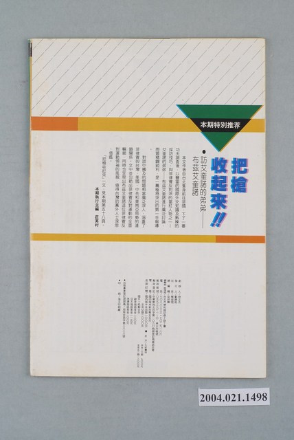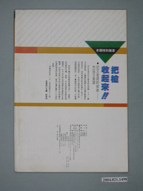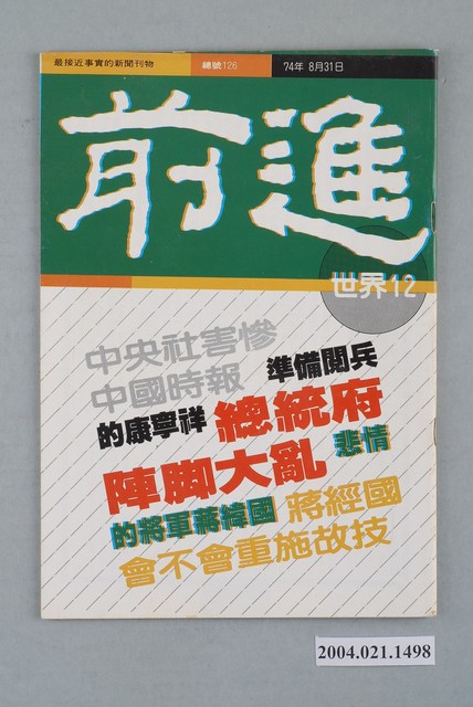 此為一紙質雜誌,此物件以白色為底,封面上半部置有綠色色塊,並以白色字體標示物件之名稱,本物件為1985年8月發行之《前進世界》週刊第12期(總號第126號),封面內容計有〈中央社害慘中國時報〉、〈準備閱兵的康寧祥〉、〈總統府大亂陣腳〉、〈悲情的將軍蔣緯國〉、〈蔣經國會不會重施故技〉、〈把槍收起來!!訪艾奎諾的弟弟――布茲艾奎諾〉等。目錄計有(一)封面故事、(1)總統府陣腳大亂-樂了王惕吾,苦了總統府(鍾紅楚)、(2)蔣經國會不會重施故技-陳誠的殷鑑不遠(李韻)、(3)戴炎輝做球,蔣中正得分-「保護憲法」的歷史醜劇(陳墾)、(4)獨家之夜-王惕吾的秘密指令(方萬里)、(5)王惕吾將軍,俞國華死棋-《時代週刊》訪問蔣經國的併發症(辛聞)、(二)獨家新聞、(1)悲情的將軍-蔣緯國二度申訴請退役的情結(水情專家)、(三)新聞後梯、(1)中央社害慘中國時報-臺灣駐韓記者看天吃飯(任君民)、(2)從中國時報到聯合報-余紀忠的舊屬朱立熙(劉俊)、(3)蕭天潤的部隊,牽涉海南島大貪污案-臺灣不該成為大陸罪犯收容所(唐堂)、(4)獨家不如敢言-給聯合報的諍言(江百合)、(四)首都別記、(1)準備閱兵的康寧祥-康寧祥的重要關頭(吳祥輝)、(2)急轉直下的王玉雲誹謗案、(3)無聊的華僑、(4)台北市議會掀開迷你十信案、(5)小小蔡辰洲、(6)監察院不敢彈劾俞國華、(五)焦點人物、(1)銀行界的瘟神-與「豬哥彬」哥倆好的王金平(柳木天)、(六)前進報導、(1)洲後村民口中的「龜仔子」-尼爾森颱風過後探訪洲後村(沈素素)、(2)超級推銷員的小雨傘-勒緊臺灣人褲帶的杜爾(杜普)、(3)情緣永在,再訂來生-尼爾森颱風夜,記郭雨新喪禮(朱自河)、(4)來自地底的地下水面面觀(楚楚)、(5)水俣症的臺灣版-臺灣的汞污染調查(沈襄)、(6)呂政操終於吃飽了-續中國時報人間副刊「呂正操的午宴」下篇、(7)乍暖還寒時候,怎一個「說」字了得!-遊說團體已成為美國的第五權(王費台)、(8)「說」了不一定算數-臺灣與中共在美國的遊說大競賽(王開)、(七)選情快報、(1)兵不厭詐、(1.1)主委有派系,作家也瘋狂-陳金讓的招式有別關中(紀英蘭)、(2)選區風雲、(2.1)尤清、鄭余鎮相執不下(汪兆同)、(2.2)台北縣黨外推出林美津競選省議員(游一桂)、(2.3)黨外坐一望二搶三(歐震天)、(八)本週特別推荐、(1)把槍收起來-訪艾奎諾的弟弟-布茲艾奎諾 等。 此物件為林正杰創辦的《前進》雜誌系列出版品之一,為黨外政論雜誌,曾受國民黨政府查禁,並陸續更改刊名,計有《前進周刊》、《前進廣場》、《前進時代》、《前進世界》等。《前進》雜誌標榜「在報禁下尋找更接近真實的客觀報導」,其重要創辦人有林正杰、蔡式淵、蔡仁堅,三人皆為民進黨早期派系「前進系」成員。所謂「黨外」為中國國民黨之外的政治勢力,「黨外」在國民黨政府的治下運用創辦雜誌的方式表達立場、對抗國民黨政府,這些雜誌、出版品被稱為「黨外雜誌」,《前進》系列亦是其中之一。