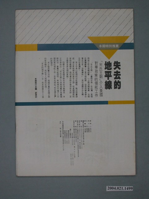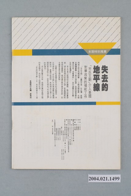 此為一紙質雜誌,此物件以白色為底,封面上半部置有藍色色塊,並以白色字體標示物件之名稱,本物件為1985年9月發行之《前進世界》週刊第13期(總號第127號),封面內容計有〈蔣經國總統的四十分鐘手術過程〉、〈蔣緯國將軍見光復活〉、〈國防部的否認前科累累〉、〈國民黨想製造第二次高雄事件〉、〈黨外後援會開始辦理候選人登記〉、〈失去的地平線――「宋氏王朝」介入美國對華政策的領航工作〉等。目錄計有(一)封面故事、(1)畫龍點睛,見權眼開-蔣經國的四十分鐘手術過程(鍾紅楚)、(2)小手術,大動作-期待蔣經國總統的連續大動作(陳墾)、(二)首都話題、(1)哥哥的大玩偶-蔣緯國將軍-駁張慧元的「純屬謠言,絕非事實」(水情專家)、(2)天下沒有不「否認」的國防部-國防部一再「否認」的原因分析及其紅色訊號(江百合)、(3)孔令晟也為年紀所苦(紀英蘭)、(三)政治颱風、(1)中共中央辦公廳文件-關於抓緊新形勢加強對台工作和對台宣傳問題的座談會紀要、(2)關於臺灣國民黨黨外刊物的認識、(3)大陸來客抓狐狸-中國之春所謂「中共中央辦公廳文件」的廿一個疑點(本刊駐美特派員周元璋)、(4)國民黨特務機構的簡體字印刷廠-「中國之春」背叛理想內幕(本刊紐約特約撰述黃錦)、(5)黨外應該建構最符合臺灣人民利益的「中國政策」(謝明達)、(6)吃革命飯的王炳章(本刊紐約特約撰述黃錦)、(四)新聞後梯、(1)蔣經國也看黨外雜誌社出版《黨外雜誌上達天聽(辛聞)、(五)選情快報、(1)兵不厭詐、(1.1)關中混水摸魚(普普)、(1.2)別人的孩子我也愛-國民黨保送林漢周(中特)、(2)選區風雲、(2.1)黃正雄「不安於室」(邱逢乙)、(3)選舉併發症、(3.1)給我校地,否則選舉-李亞頻的進退妙計(葉凡)、(4)黨外召集令、(4.1)一九八五黨外選舉後援會選舉公告、(六)前進報導、(1)怕火燙就不要當火箝-鐵面御史不敵粉面御史(柳木天)、(2)今生今世不要再見到第二個陳蘭皋-陳蘭皋毀我良多(王水水)、(3)核一廠發生慘劇-輻射外洩,員工嚴重感染(姚國建)、(4)希望李達海部長沒有什麼嫌疑才好(沈素素)、(5)數饅頭,混退伍、(6)俞國華「最明顯而立即」的行情-俞內閣使股市下跌三百點,國民財務損失一千億(宋明英)、(7)秦孝儀、宋楚瑜、李雲漢大乾杯-解開「一個喝醉的水手」的秘密(陳仲亭)、(七)本週特別推荐、(1)失去的地平線-從「宋氏王朝」看它背後的訊息(周鳴)、(八)學術思潮、(1)「臺灣研究」成為國際學術研究的新焦點-記芝大首屈「臺灣研究國際研討會」(南方朔)、(九)前進之聲、(1)賊和賊,呼應唱和-對所謂「中共中央辦公廳文件」的看法(林正杰)、(十)托斯基夫人專欄、(1)兒子被排斥老爸繼續幹 等。 此物件為林正杰創辦的《前進》雜誌系列出版品之一,為黨外政論雜誌,曾受國民黨政府查禁,並陸續更改刊名,計有《前進周刊》、《前進廣場》、《前進時代》、《前進世界》等。《前進》雜誌標榜「在報禁下尋找更接近真實的客觀報導」,其重要創辦人有林正杰、蔡式淵、蔡仁堅,三人皆為民進黨早期派系「前進系」成員。所謂「黨外」為中國國民黨之外的政治勢力,「黨外」在國民黨政府的治下運用創辦雜誌的方式表達立場、對抗國民黨政府,這些雜誌、出版品被稱為「黨外雜誌」,《前進》系列亦是其中之一。