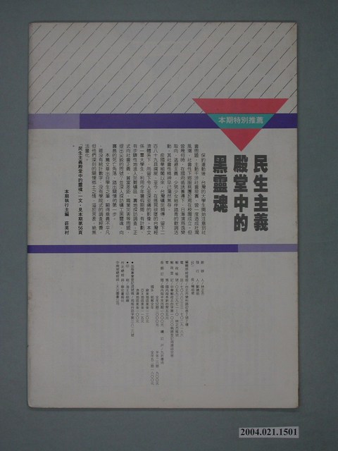 此為一紙質雜誌,此物件以白色為底,封面上半部置有紫色色塊,並以白色字體標示物件之名稱,本物件為1985年9月發行之《前進世界》週刊第15期(總號第129號),封面內容計有〈本刊獨家報導――海軍旗魚潛艇被迫解除武裝〉、〈前進的「九一八」休刊聲明〉等。目錄計有(一)休刊詞、(1)告讀者-雜誌型前進休刊、報紙型前進繼續發言(林正杰)、(二)封面故事、(1)海軍旗魚潛艇被迫解除武裝-美國全面干涉我國武器採購(古元義)、(2)聲淚俱下的總司令-劉和謙自承對不起海軍(歐陽將軍)、(三)首都話題、(1)特務抓特務-王昇手下大將李亞頻被捕(周仲庚)、(四)焦點人物、(1)將軍!救命!-出身政工系統的政娟娥(林少康)、(五)新聞後梯、(1)跳蛙之旅-李登輝在中南美洲左閃右躲(羅俊哲)、(六)海外文摘、(1)那一夜,康寧祥說相聲-康寧祥的晚宴(莫靈平)、(七)世界頭條、(1)老貓新花招-九命怪貓鄧小平的新班底(王宣德)、(2)老子下班,兒子上工-中共的新貴族「太子黨」(陳墾)、(八)前進報導、(1)逃亡第三波-臺灣人的逃亡症候群(莊英村)、(2)道不行,改行拉保險-周天瑞隱忍待發(平平)、(九)選情快報、(1)兵不厭詐、(1.1)關中咬省民耳朵-省黨部頻施小動作(侯德凱)、(2)選將特寫、(2.1)曾文坡的鈔票與選票-高潮迭起的台中市長選情(楊麗蓉)、(2.2)番刀出鞘-第一把番刀一凡˙尤幹(瓦利斯)、(十)人物專訪、(1)第三世界的第一大報-訪西班牙「國家報」副社長(徐燕雄)、(2)悠揚的橫笛-訪唐山樂集創辦人陳百忠(李霞飛)、(十一)本週特別推荐、(1)民生主義殿堂中的黑靈魂-挨家挨戶探訪災變一年後的海山礦區(左更新)、(十二)托斯基夫人專欄 等。 此物件為林正杰創辦的《前進》雜誌系列出版品之一,為黨外政論雜誌,曾受國民黨政府查禁,並陸續更改刊名,計有《前進周刊》、《前進廣場》、《前進時代》、《前進世界》等。《前進》雜誌標榜「在報禁下尋找更接近真實的客觀報導」,其重要創辦人有林正杰、蔡式淵、蔡仁堅,三人皆為民進黨早期派系「前進系」成員。所謂「黨外」為中國國民黨之外的政治勢力,「黨外」在國民黨政府的治下運用創辦雜誌的方式表達立場、對抗國民黨政府,這些雜誌、出版品被稱為「黨外雜誌」,《前進》系列亦是其中之一。