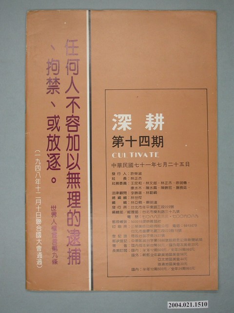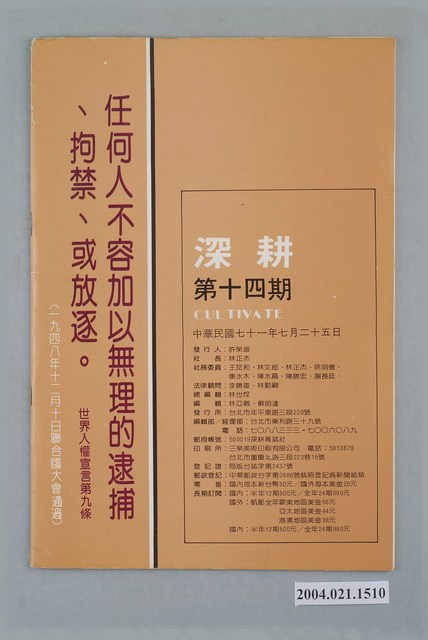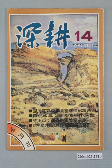 此為一紙質雜誌,此物件以畫作為封面,並以靛色字體標示物件之名稱,本物件為1982年7月發行之《深耕》半月刊第14期(總號第14期),封面內容計有〈國民黨立委擴張警察權紀念週〉、〈特別報導:最後陳述座談會〉、〈黨外巨頭美國之旅〉(林正杰)、〈康寧祥與張德銘對杯葛問題的回答〉等。目錄計有(一)封面、(1)野柳巨岩(1981)(葉火城)、(二)我們絕不輕言放棄(許榮淑)、(三)地下室手記(本社)、(1)歷史絕不會輕易放過、(四)讀者投書(本社)、(五)一頁人權滄桑、(1)兩岸猿聲啼不住,輕舟已過萬重山-國民黨立委擴大警察權紀念週(鄭南榕)、(2)最後陳述座談會(本社)、(2.1)採用那一國的立法例?(林山田)、(2.2)不能再沈默了!(張忠棟)、(2.3)我們已是民主法治的國家(賴浩敏)、(2.4)一波未平,一波又起(蘇貞昌)、(2.5)不知所云的條文修正案(蔡墩銘)、(2.6)人權.憲法.訴狀法(李鴻禧)、(2.7)草率立法,令人不安(吳亞力)、(2.8)孤臣無力可回天(江鵬堅)、(2.9)恐非國家人民之福(林勤綱)、(2.10)違反世界潮流的危機(郭吉仁)、(2.11)誰敢保証我們不在街頭被抓(尤英夫)、(2.12)表決.惡法.立委(謝長廷)、(2.13)最後的警告(張忠棟)、(3)「法律遁」和「法律頓」(李敖)、(4)鐵石集-民意.黨意.鬼意(卜平)、(六)黨外巨頭美國之旅、(1)民主運動在臺灣--史丹福大學演講記(林正杰)、(2)康寧祥與張德銘對杯葛事件的回答(林正杰)、(3)從全美市長會議歸來--訪黃石城縣長(胡翊夫)、(七)黨外.黨外(本社)、(八)生活與政治、(1)蟬--送給議壇奮鬪的朋友(紀萬生)、(2)認識你自己--由不升國旗不唱國歌講起(田朝明)、(3)你看布袋戲嗎--談無菌的電視政策(林小魚)、(九)鄉土與人物、(1)臺灣武裝抗日秘史(四)(廖祖堯議)、(十)漫畫(PIC) 等。 此件為《深耕》雜誌的系列刊物之一,《深耕》為1981年由黃石城創辦的黨外政論雜誌,後交由許榮淑經營,主要主筆人包含林正杰、林世煜、林濁水等,其中內容包括編輯手記、國會趨勢、選舉與黨外動向、生活與政治、鄉土人物、藝文、漫畫等等。《深耕》曾在1982年對於「杯葛事件」中的部分黨外立委進行批判,並引起當時黨外勢力的對立。所謂「黨外」為中國國民黨之外的政治勢力,「黨外」在國民黨政府的治下運用創辦雜誌的方式表達立場、對抗國民黨政府,這些雜誌、出版品被稱為「黨外雜誌」,《深耕》系列亦是其中之一。