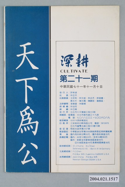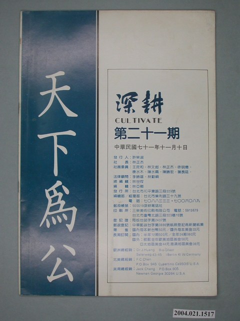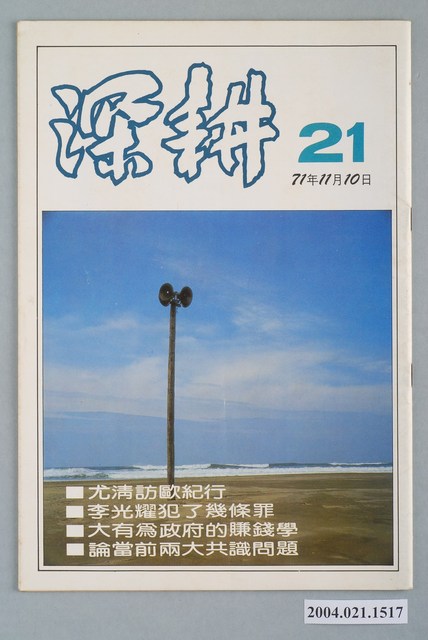 此為一紙質雜誌,此物件以畫作為封面,並以白色字體標示物件之名稱,本物件為1982年11月發行之《深耕》半月刊第21期(總號第21期),封面內容計有〈尤清訪歐紀行〉、〈李光耀犯了幾條罪〉、〈大有為政府的賺錢學〉、〈論當前兩大共識問題〉等。目錄計有(一)封面、(1)說給誰聽(史維綱)、(二)地下室手記(本社)、(三)讀者投書(本社)、(四)當前重大國是評議、(1)論當前兩大共識問題(林世煜)、(2)何謂基本國策(林亞卿)、(3)公民對抗國民(鄭南榕)、(4)李光耀犯了幾條罪?-假如李光耀是中華民國國民(吳法)、(5)從黃越欽評基本法談起(朱三才)、(五)問政議壇、(1)大有為政府的賺錢學(廖達人)、(2)國民黨霸佔市民財產-台北市議會公開指責(林不揚)、(3)莫以耍賴為看家本領-北市議會有關勞工,選罷法的質詢(周中緣)、(六)黨外.黨外(本社)、(七)生活與政治、(1)尤清訪歐紀行(胡翊夫)、(2)黨產之謎(吳文迫)、(3)一個不及格的學生-林洋港(鄭致學)、(4)反對中共在臺灣附近試射飛戰(潘立夫)、(5)律師高考抗議事件-政治目的封殺考試窄門(加非)、(6)贏得選舉,輸去民意-臺大代聯會主席選舉側記(臺大魂)、(7)傷心「留目油」、(八)地方政情、(1)中壢垃圾戰爭(林惠菁)、(2)狂態畢露的冷血官僚(陳富信)、(九)反共無罪?、(1)給索忍尼辛上一課(申申)、(2)索尼忍辛與隱私權-從索忍尼辛來訪談起(尤英夫)、(3)鐵石集:是夸夫?還是侏儒?-都是索忍尼辛惹的禍(卜平)、(十)踏步精神(徐榮淑)、(十一)國際觀察、(1)綠色黨-西德政局的新台風眼(怡民)、(2)散波戰爭火種的國家-武器輸出大國-法國的剖析(王開譯)、(十二)漫畫(PIC) 等。 此件為《深耕》雜誌的系列刊物之一,《深耕》為1981年由黃石城創辦的黨外政論雜誌,後交由許榮淑經營,主要主筆人包含林正杰、林世煜、林濁水等,其中內容包括編輯手記、國會趨勢、選舉與黨外動向、生活與政治、鄉土人物、藝文、漫畫等等。《深耕》曾在1982年對於「杯葛事件」中的部分黨外立委進行批判,並引起當時黨外勢力的對立。所謂「黨外」為中國國民黨之外的政治勢力,「黨外」在國民黨政府的治下運用創辦雜誌的方式表達立場、對抗國民黨政府,這些雜誌、出版品被稱為「黨外雜誌」,《深耕》系列亦是其中之一。