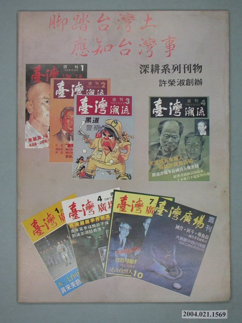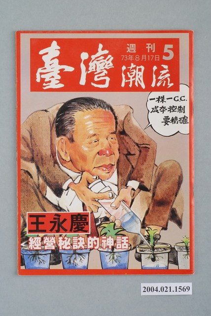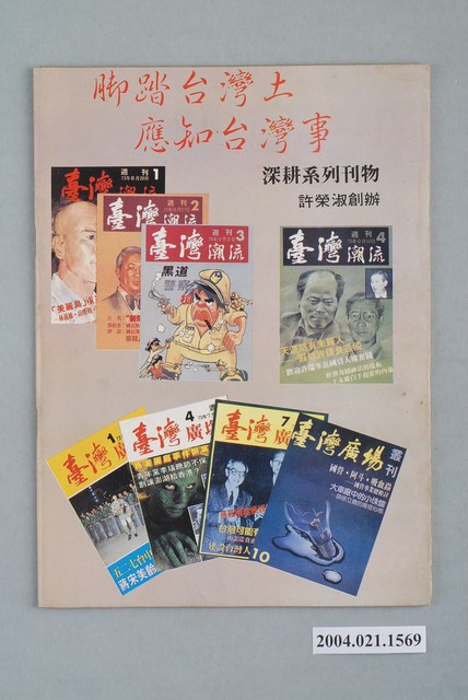 此為一紙質雜誌,在封面上方寫有本書標題、期號以及出版日期,並在封面刊有王永慶的插圖,另外節錄本刊物的部份內容,背面則刊有深耕系列刊物的廣告。此書為臺灣年代雜誌社1984年出版的《臺灣潮流》週刊第5號。 此件為《深耕》雜誌的衍生刊物之一,其最重要的發行人為許榮淑。《深耕》相較其他同時期的雜誌更富有批判性,亦更受社會矚目,其批判對象並不僅限於國民黨,連當時的黨外勢力也同時受其針砭。代表案例是其在1982年「杯葛事件」中針對「黨外主流派」妥協立場的批判。《深耕》成為黨外運動路線改變的原因之一,另外也造成黨外勢力的對立。 「黨外」一詞主要為非中國國民黨的臺灣政治勢力,而「黨外」政治勢力,主要的宣傳方式為「黨外雜誌」,「黨外雜誌」最早如1950年代的《自由中國》、1970年代的《大學》、《臺灣政論》,後在1980年代「黨外雜誌」發展蓬勃,代表刊物為《八十年代》與《美麗島》,最終,這股媒體趨勢在1986年民進黨成立、1987年解除戒嚴之後逐漸式微。「黨外雜誌」在當時激起了臺灣民眾的民主意識,也逐步促成了言論自由開放。(蕭淑玲,2006,153-155)。