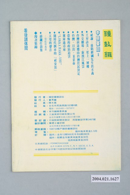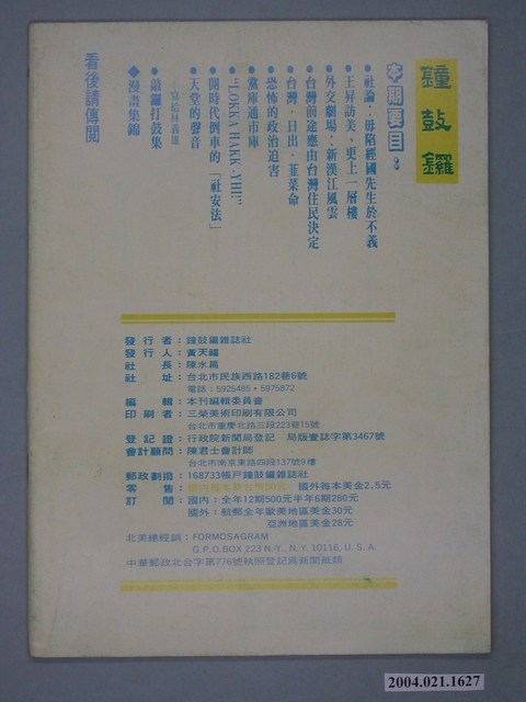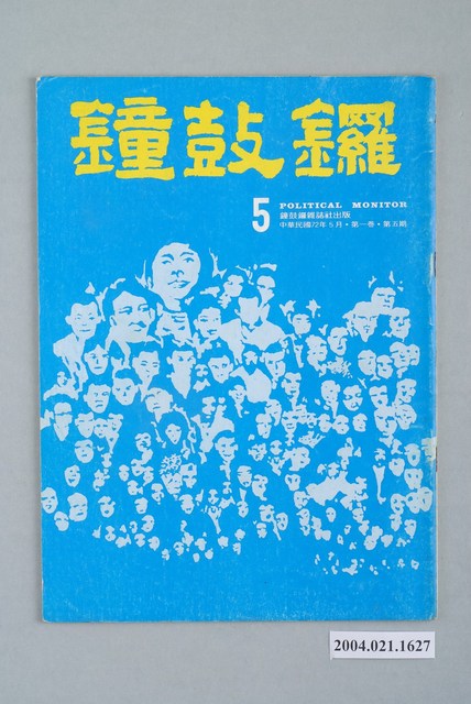 此為鐘鼓鑼雜誌社1983年5月出版的《鐘鼓鑼》雜誌第1卷第5期總號第5號,內容計有〈毋陷經國先生於不義〉、〈台灣.日出.韮菜命〉(潘立夫)、〈組黨.總辭.共同政見〉(何文振)、〈王昇訪美,更上一層樓?!〉(秦三)、〈新漢江風雲〉(小場記)、〈台灣前途由台灣住民決定〉( 阿里山人)、〈台北市議會的「黨同伐異」〉( 吳明山)、〈黨庫通市庫〉、〈黨外省議員對上黃昆輝〉(張正德)、〈馬槽山莊的鬥爭內幕〉(陳知行)、〈開時代倒車的「社會安寧秩序維護法」〉( 倪良台)、〈天堂的聲音-寫給林義雄律師〉( 曾心儀)、〈國民黨的選前選舉設計〉(廖祖堯)等。 此物件為《鐘鼓鑼》雜誌,此雜誌的前身為《鐘鼓樓》雜誌,且在1980年「美麗島大審」後不久,就接著創刊,創刊號可謂是美麗島事件專號,然而立刻遭到查禁,於是創刊人黃天福(為黃信介之弟),於1983年1月創辦《鐘鼓鑼》,並自詡做為黨外力量的先鋒,並投身爭取民主政治的「戰場」之中,此雜誌為1980年代崛起的黨外雜誌之一,重要的創辦人黃天福以及陳水扁。 「黨外」一詞主要為非中國國民黨的臺灣政治勢力,而「黨外」政治勢力,主要的宣傳方式為「黨外雜誌」,「黨外雜誌」最早如1950年代的《自由中國》、1970年代的《大學》、《臺灣政論》,後在1980年代「黨外雜誌」發展蓬勃,代表刊物為《八十年代》與《美麗島》,最終,這股媒體趨勢在1986年民進黨成立、1987年解除戒嚴之後逐漸式微。「黨外雜誌」在當時激起了臺灣民眾的民主意識,也逐步促成了言論自由開放。(蕭淑玲,2006,153-155)。