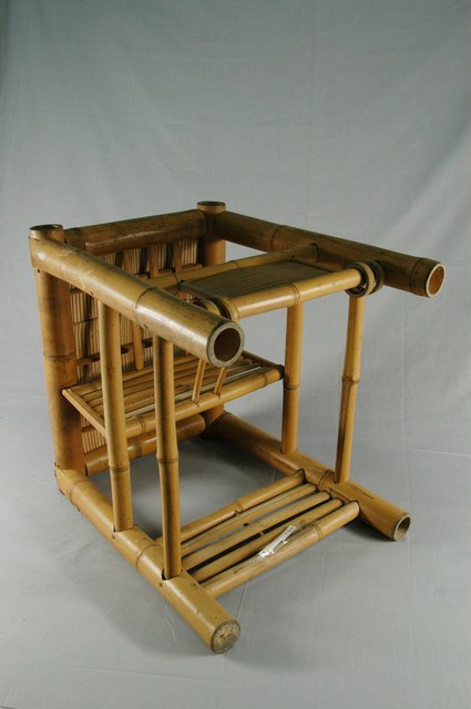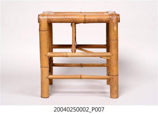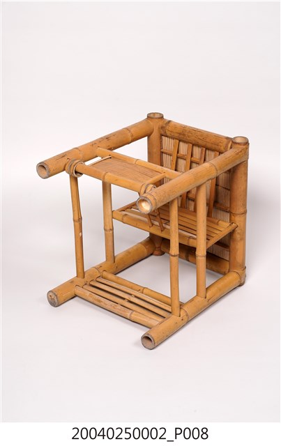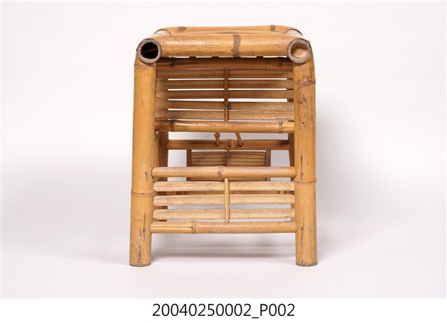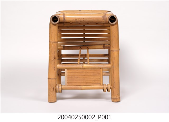 1.本件為傳統社會常見的竹製子母椅,長38公分、寬42.9公分,高45.7公分,整件皆以竹子製成,以竹管彎撓榫接組成,椅面則為竹片。子母椅是傳統工藝中的兩用家具,正面放置時可作為一般竹凳使用,側面擺放,則可當作嬰兒用椅。