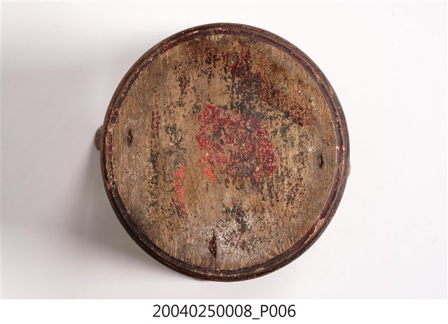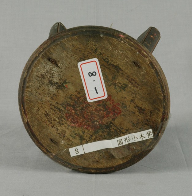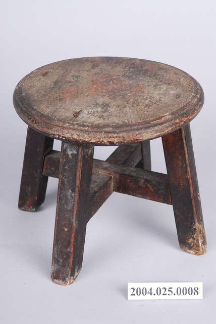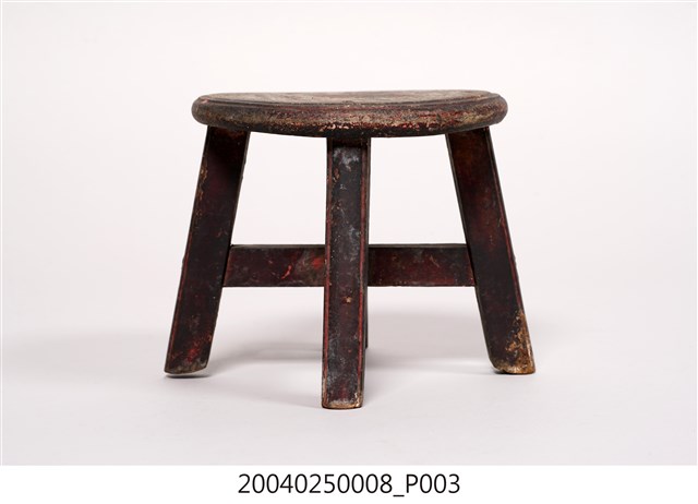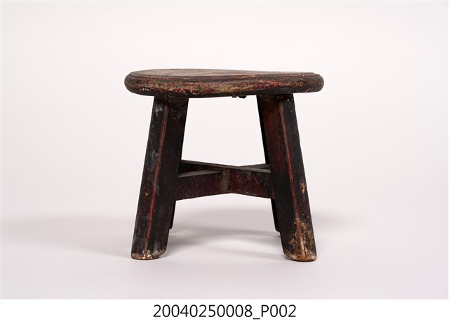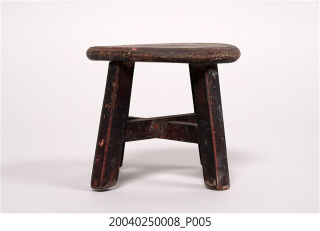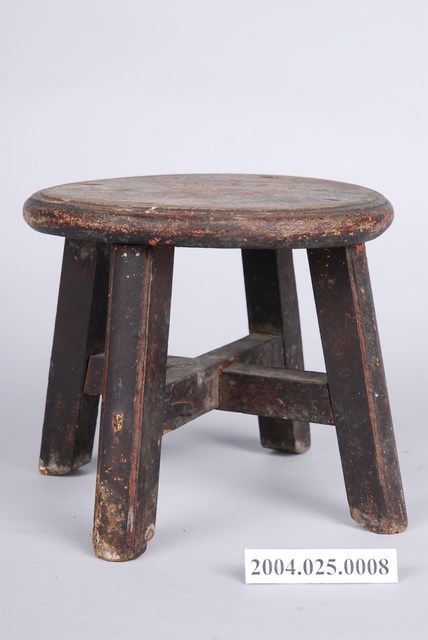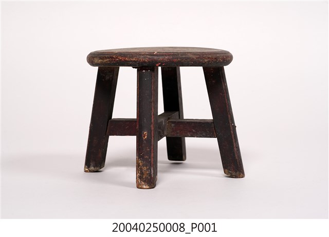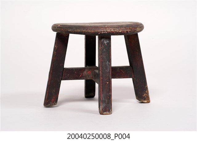 1.本藏品為木製圓形小凳子,長18公分、寬17.9公分,高13.6公分,整體以7個木頭組件組成,圓形的椅面與4支方形椅腳,另有兩支X形交叉的椅棖,組件之間以榫卯與鐵釘固定連結,凳子內外通體都沒有裝飾,原有的黑色漆面多已剝落,外敞的凳子腳給人穩重實用之感。
