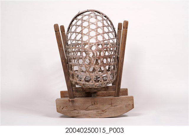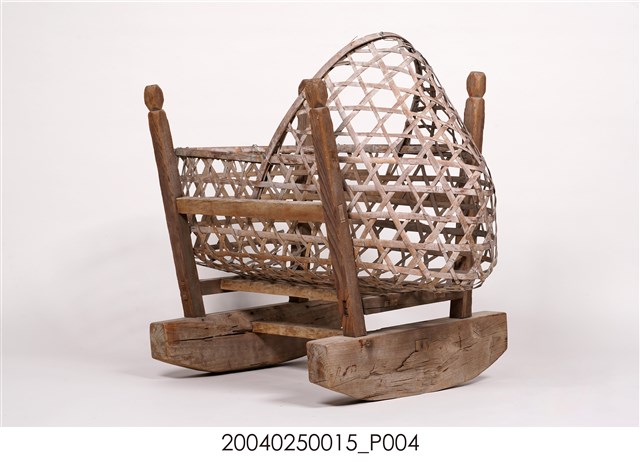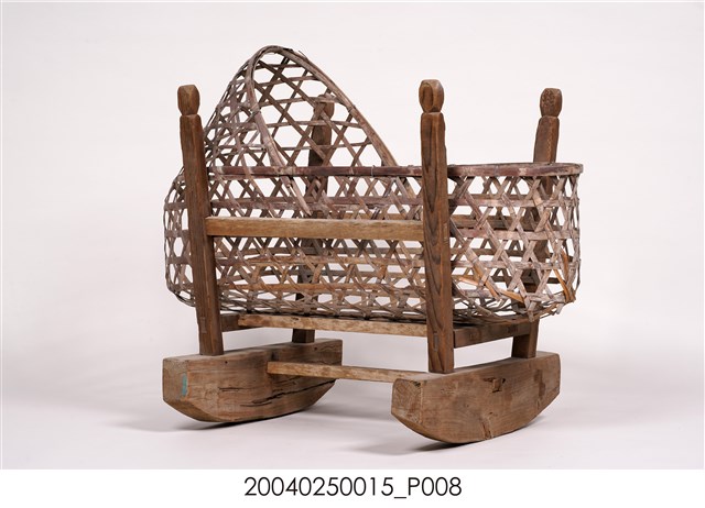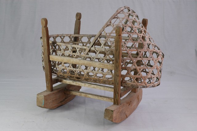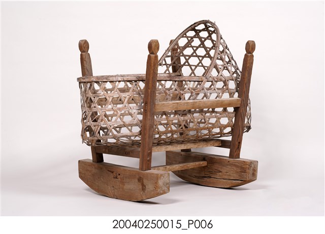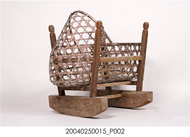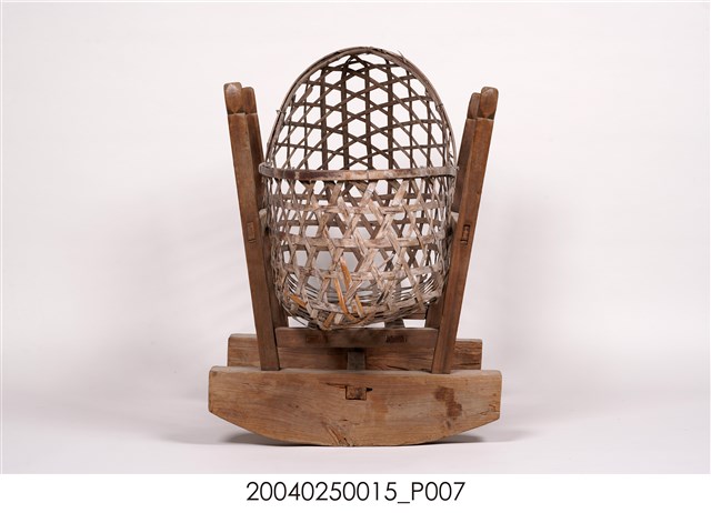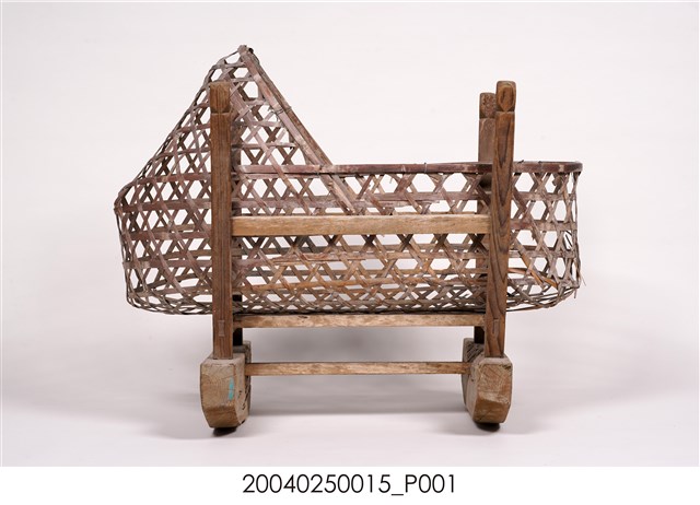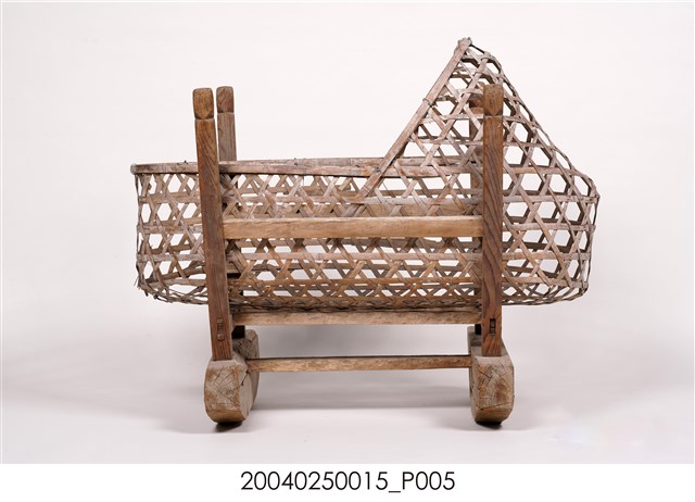本文物為竹製搖籃,搖籃為橢圓形狀,由竹片編織而成,搖床外緣使用鐵絲綑綁,加以穩固。搖架為木頭製作,由四條木頭,兩兩接合於半弧形的木頭上。搖籃與搖架表面都有些許的污漬與刮痕。其使用方式為將搖籃放在搖籃架上則可左右推動使嬰兒入睡。哺育嬰孩為傳統婦女在家之重要工作,搖籃則方便女性無須時時刻刻揹著嬰孩進行勞動,呈現當時家庭中的婦女需要擔起家庭事務與照顧孩子的責任。