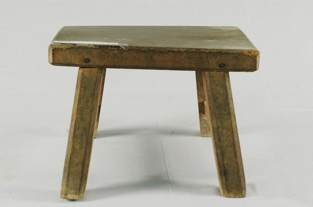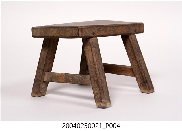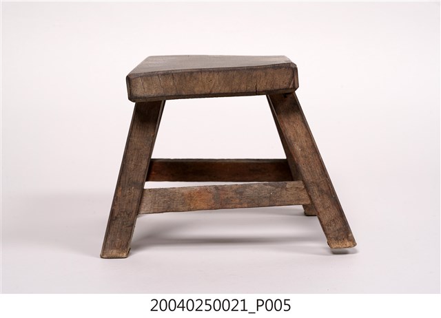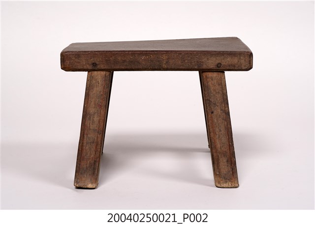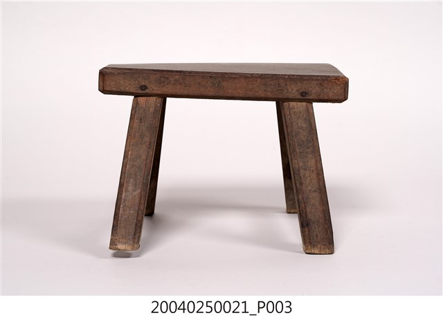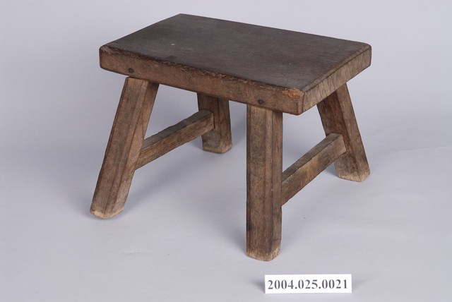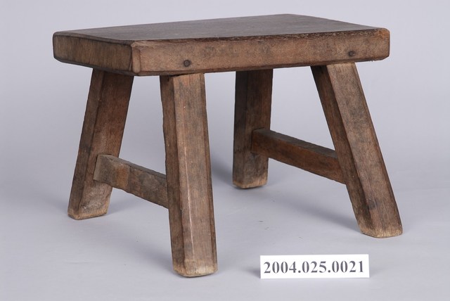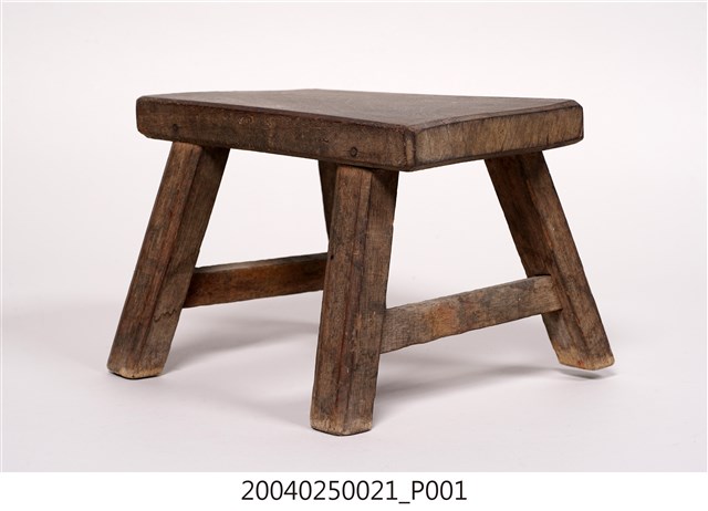 1.本藏品為木製小型凳子,長27.3公分、寬26.4公分,高20.2公分,長方形的凳子有外敞的4根方形腿足,短面的腿足之間有橫向棖木,皆以榫卯連接,通體不施裝飾,也未加漆,整體造型簡潔做工樸實,給人簡單實用之感。