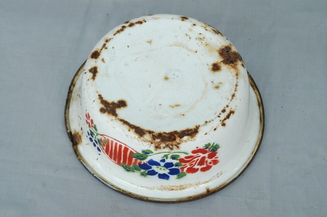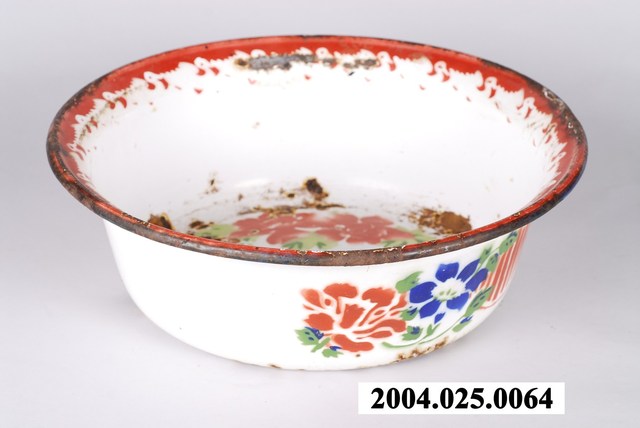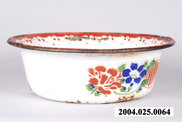 1.此為搪瓷製面盆,長約36.7公分,寬約35.8公分,高約11.9公分。器身撇口淺壁圓盆,口緣外撇折沿,以紅色鴛鴦飾帶圍繞,口緣多已鏽蝕,內壁肩部黏有二.25字樣之紅框標籤紙。器身以白色為底,器底內側中央繪有鴛鴦戲水、紅花等池畔景色,外側壁面以紅藍花點綴,底部印有THREE STAR BRAND品牌藍色商標,多有帶狀鏽蝕落漆。2.傳統盥洗時,需在大灶燒熱水或於水缸盛冷水後,倒入面盆之中洗臉或洗手。面盆會搭配洗臉台,使用高度較為方便。此外,繪有鴛鴦之面盆大多也作為女子出嫁嫁妝,象徵夫妻如鴛鴦一般白頭偕老、永浴愛河。